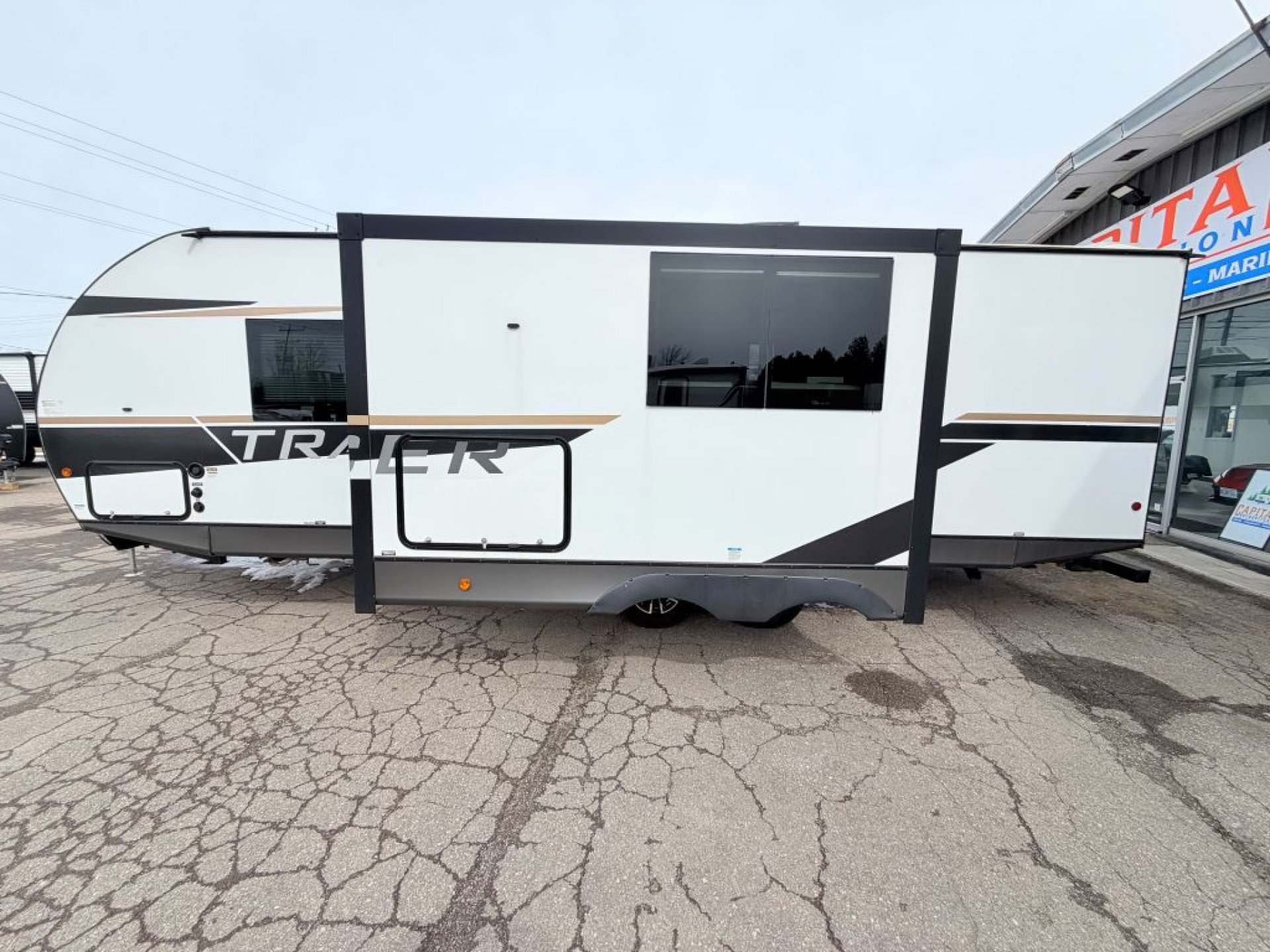 Constructed with a lightweight aluminum frame and laminated fiberglass exterior, the Tracer 255DS ensures durability and ease of towing. The Eternabond construction and fully enclosed underbelly contribute to the trailer's longevity and late-season usability. Modern technological features include a tankless water heater, ducted 15,000 BTU air conditioner, and a 200 watt solar panel and backup camera prep, keeping you comfortable and connected wherever your travels take you.