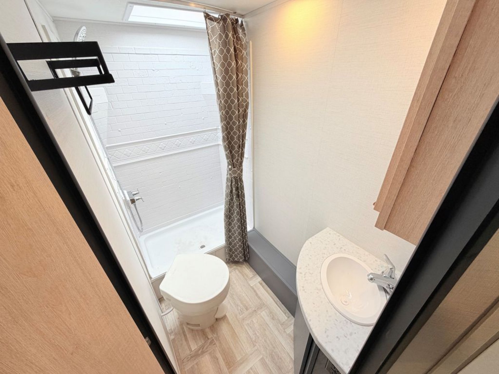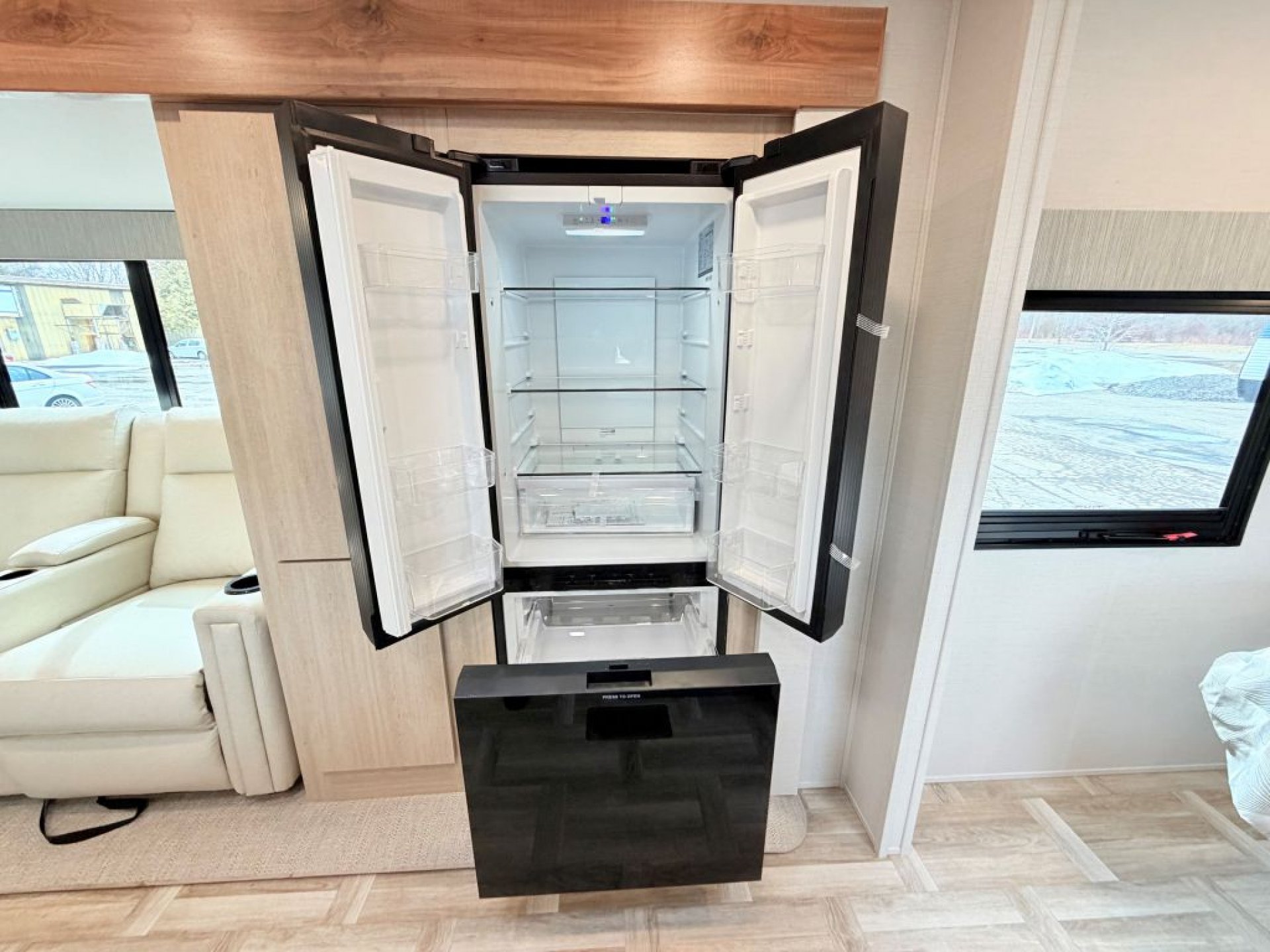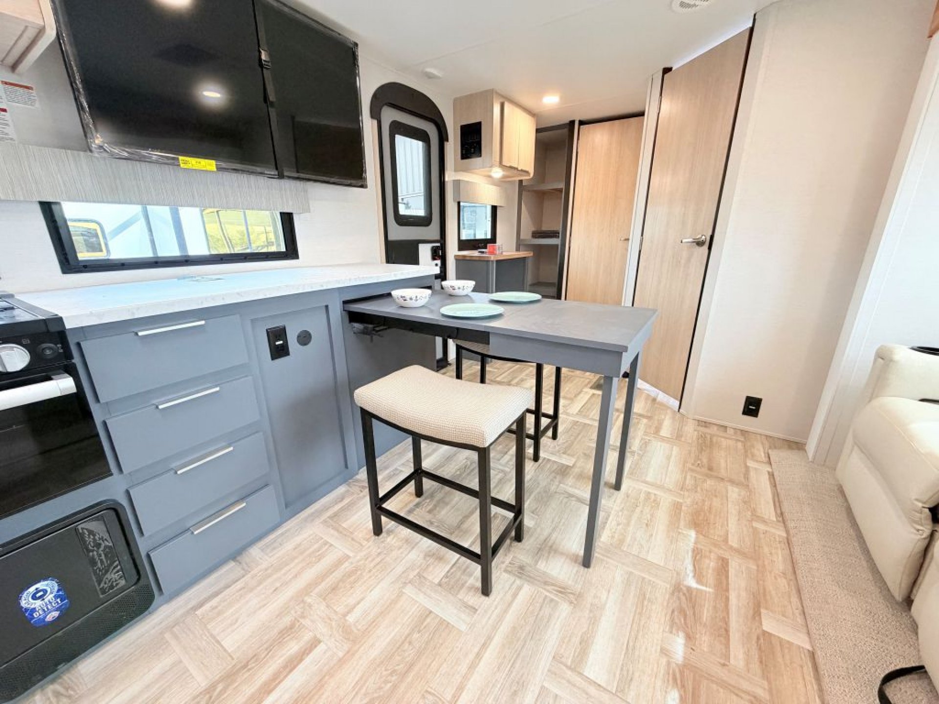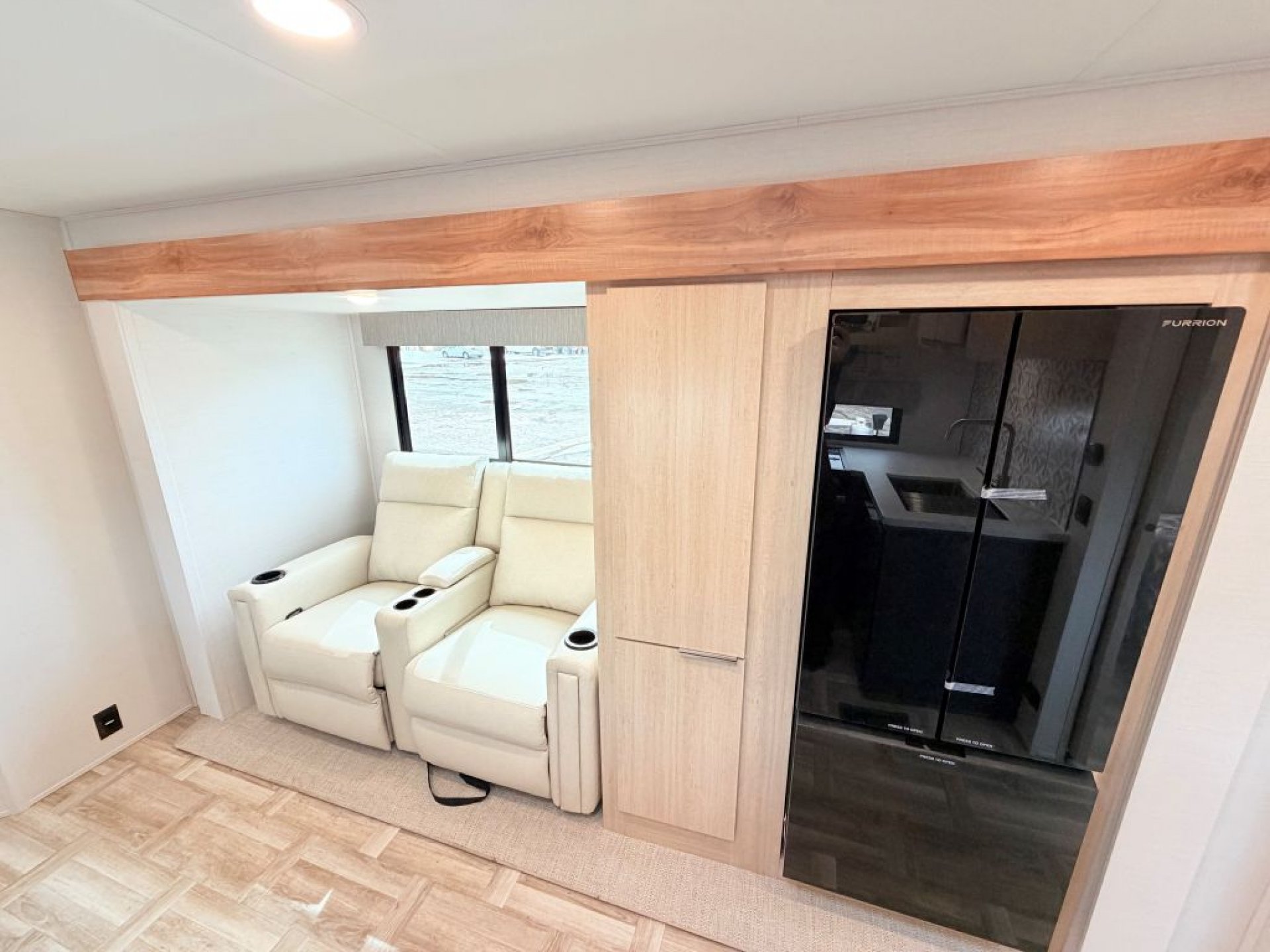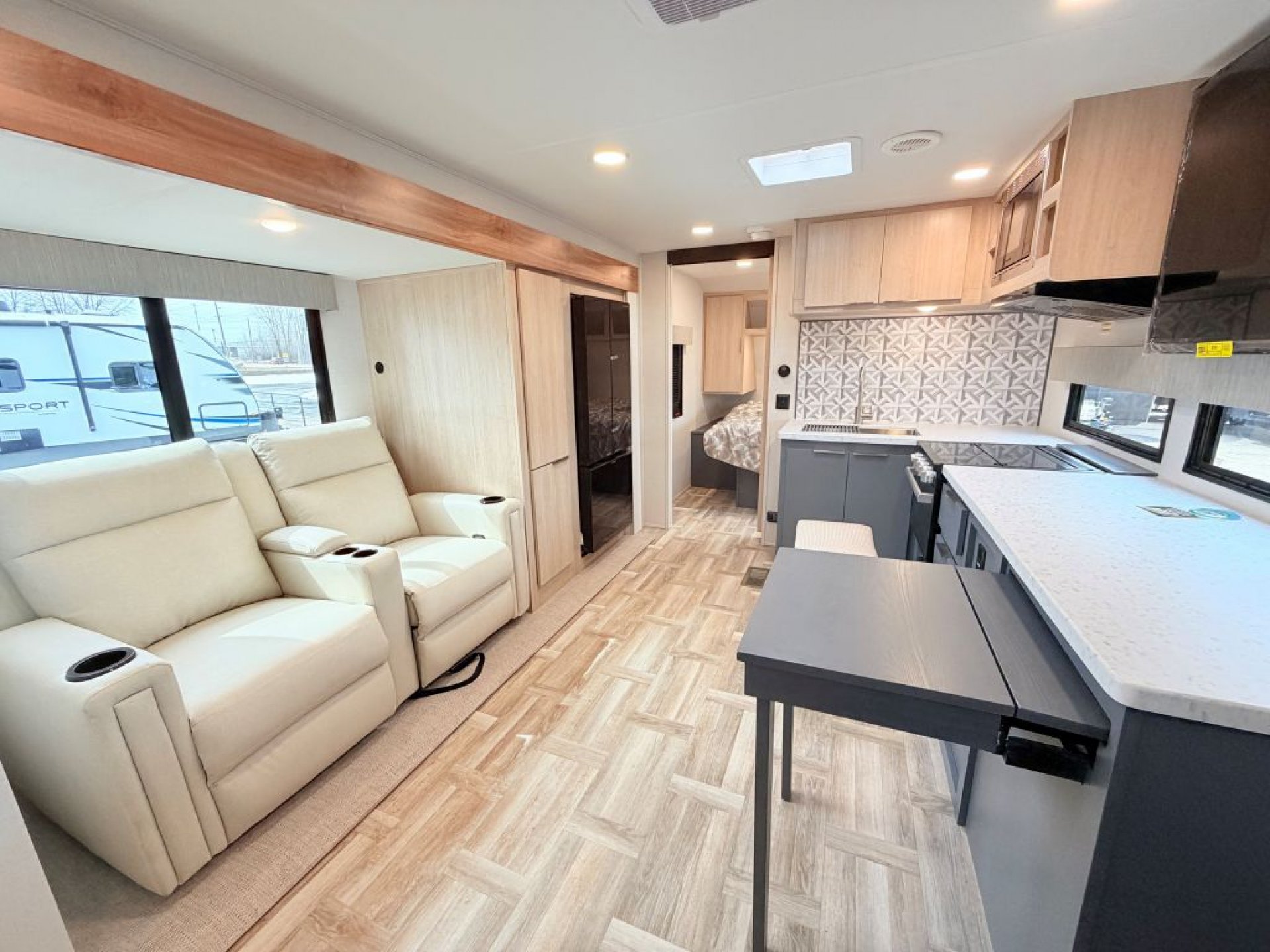 The well-appointed kitchen comes equipped with a 12V refrigerator, microwave, three-burner gas cooktop with oven, and a low-profile range hood. Ample counter space and a pantry make meal preparation a breeze. Adjacent to the kitchen, the living area boasts theater seating, perfect for relaxing or entertaining. Large panoramic windows flood the space with natural light, creating an open and airy ambiance.