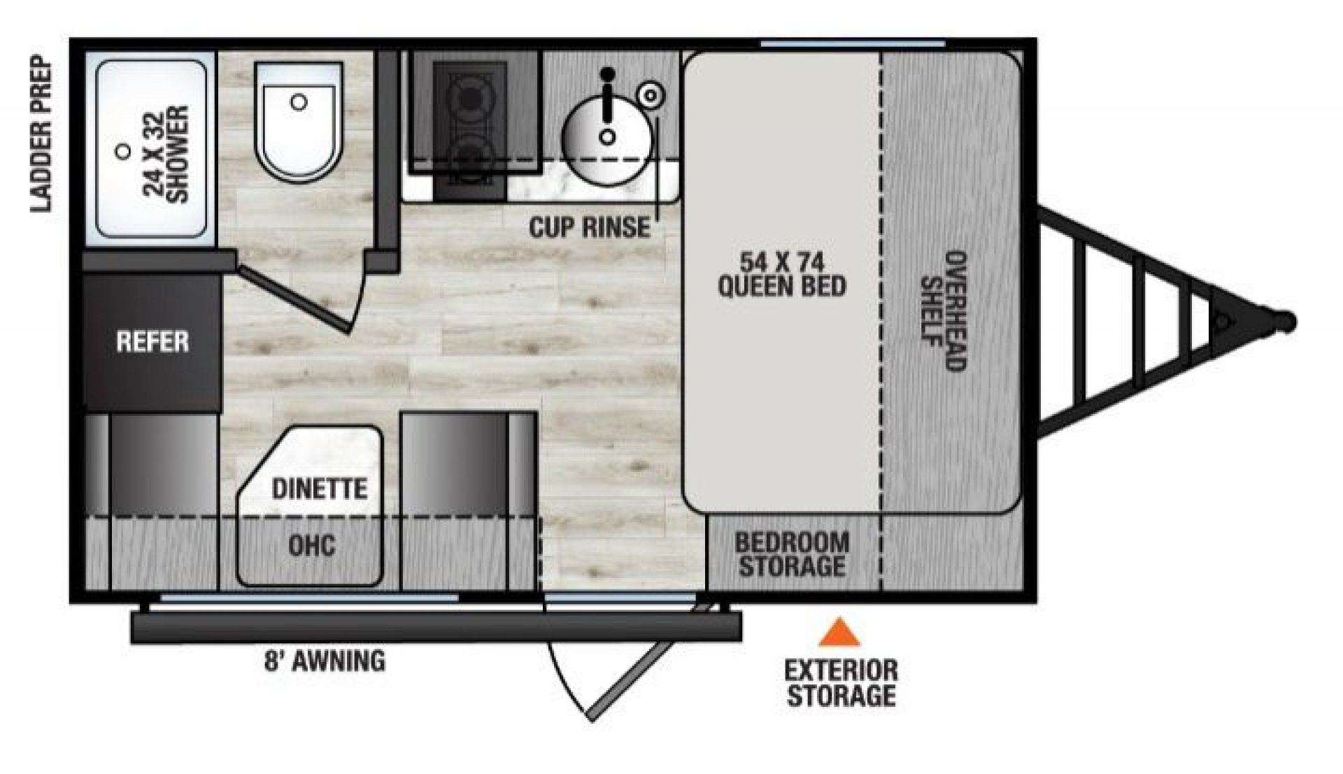 - Awning: 8' Power with LED Strip and Adjustable Legs