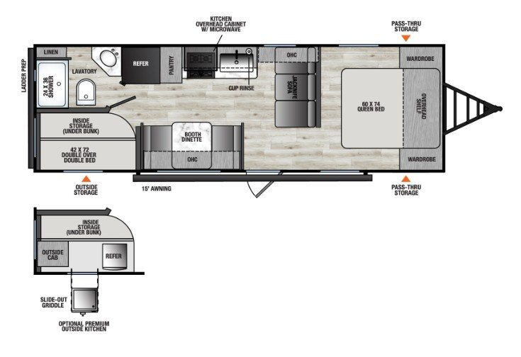 This is a relaunch of the industry’s top selling non-slide bunk house floorplan. The 26BH features an open-space concept. It features double-over-double bunks, full pantry, large bathroom with added storage and an interior bathroom sink, 4-person dinette, prepped for an outside kitchen, and a jack-knife sofa with side-overhead cabinets. This trailer is built for a family with more than two kids that wants more interior living space and comfort. #CampEasy