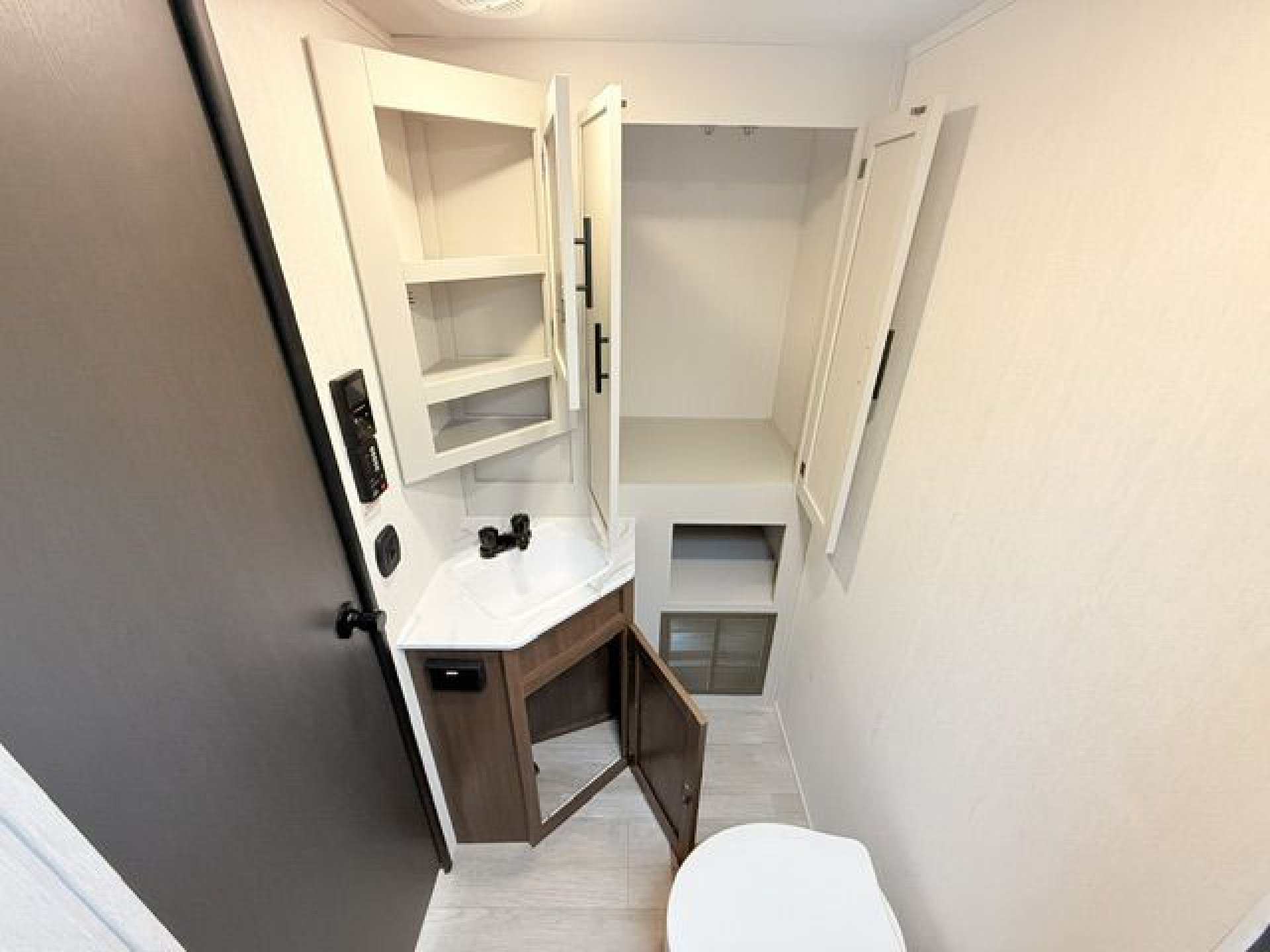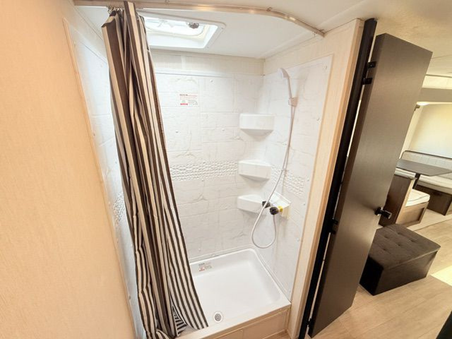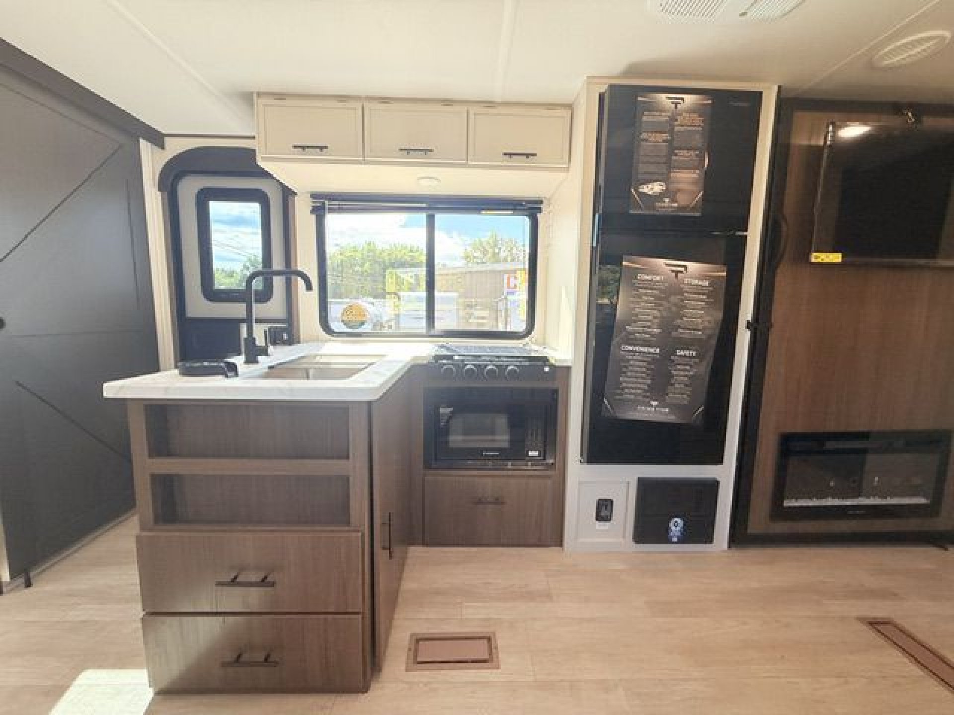 - Interior Features: Enclosed overhead storage in bedroom, dual shirt closets, bedside shelving with 110V outlets & USB ports, designer bedding package, massive bedroom window, Camp King bed, underbed storage with storage totes, TV prep in bedroom, designated shoe & pet bowl storage, stainless steel farmhouse sink, rolling sink cover/drying rack, two spice racks, two standard kitchen drawers, dedicated trash can storage, built-in convection microwave with air fryer, three-burner cooktop with glass cover, seamless pressed countertops, cup washer, onboard water filtration system, high-rise kitchen faucet, massive kitchen window, enclosed overhead storage in kitchen, 12V refrigerator 10.6 cu. ft., 12V kitchen fan, hidden pantry (most models), LED TV, electric fireplace (most models), jack knife sofa, collapsible ottoman with storage, woven PVC marine grade slideout flooring, Congoleum flooring, designer shower surround with integrated shelving, foot flush toilet, medicine cabinet, tank monitor, 30K BTU furnace, tankless on-demand water heater, 15K ducted A/C.