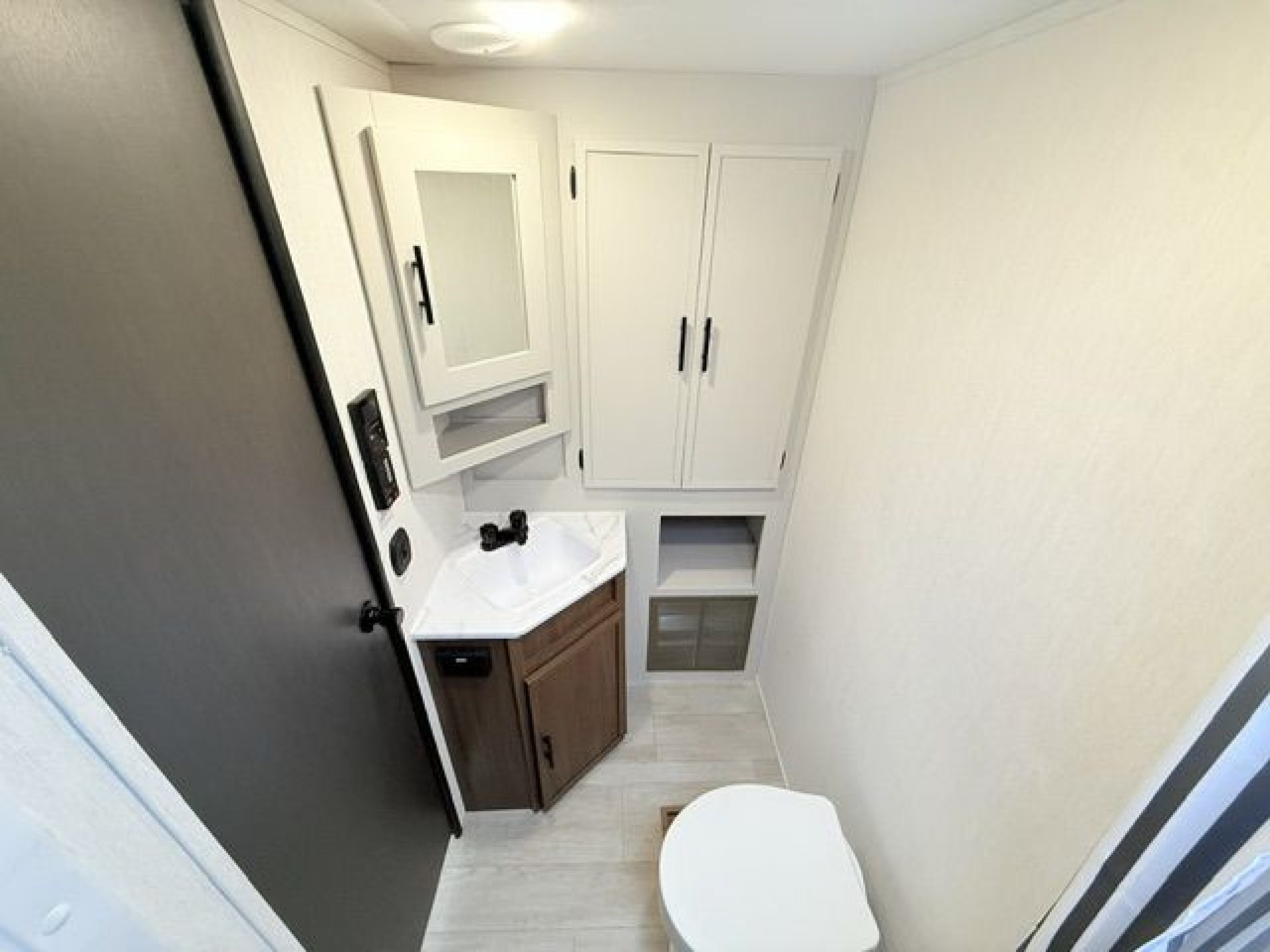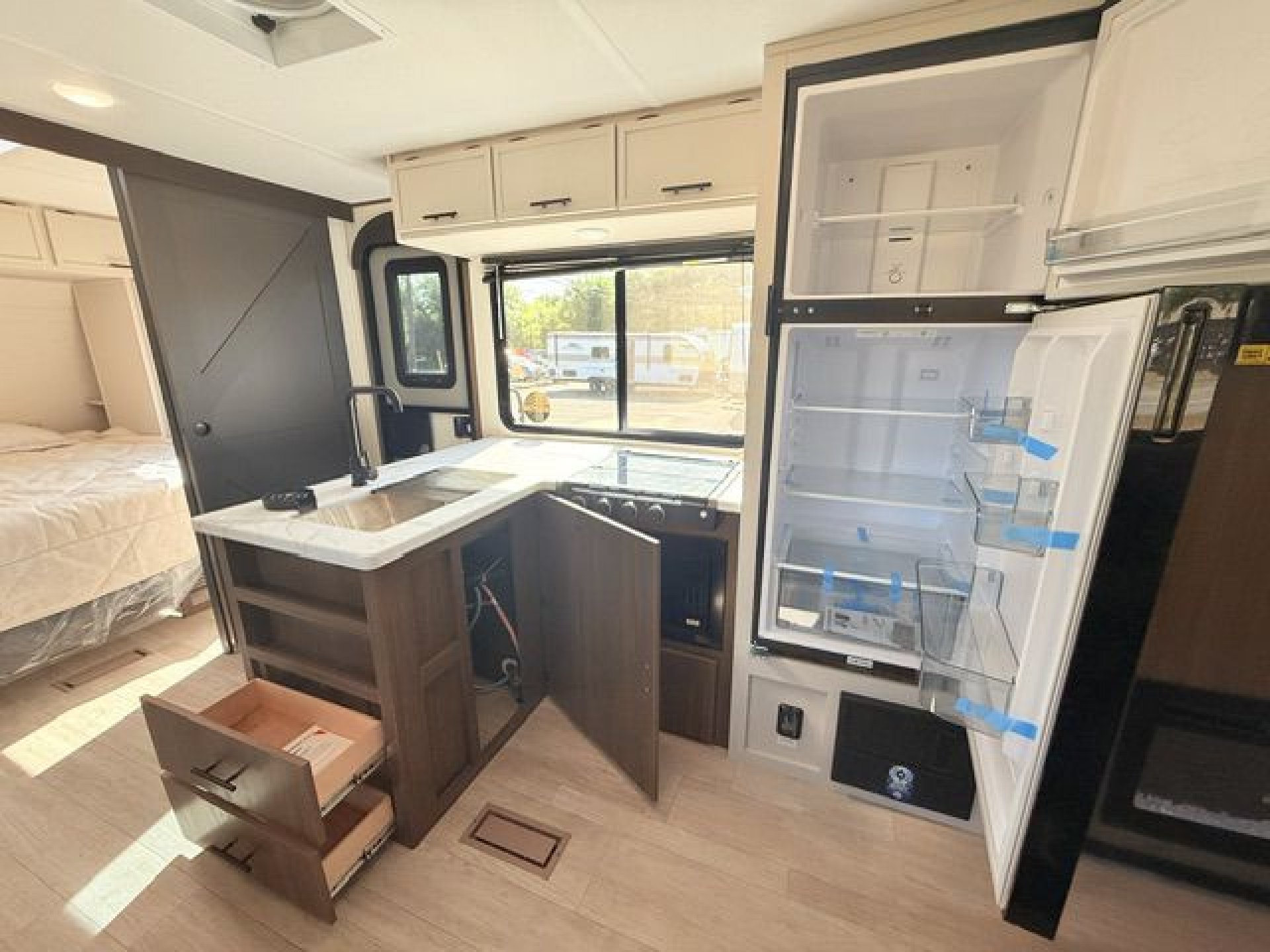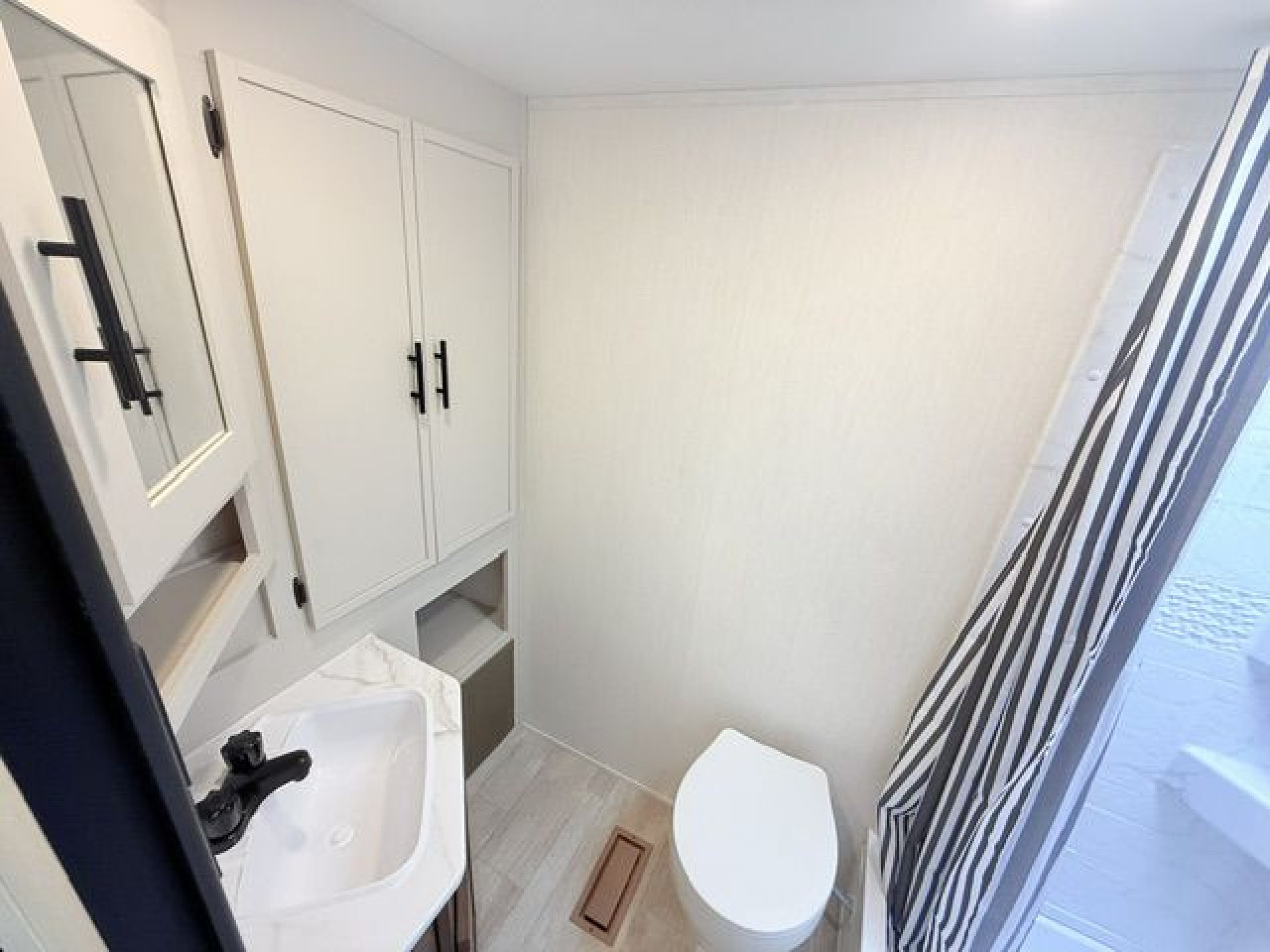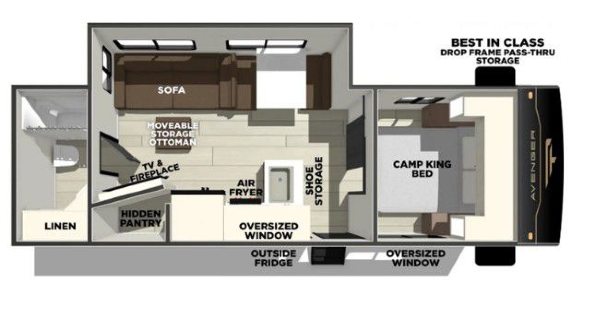 - Interior Features: Enclosed overhead storage in bedroom, dual shirt closets, bedside shelving with 110V outlets & USB ports, designer bedding package, massive bedroom window, Camp King bed, underbed storage with storage totes, TV prep in bedroom, designated shoe & pet bowl storage, stainless steel farmhouse sink, rolling sink cover/drying rack, two spice racks, two standard kitchen drawers, dedicated trash can storage, built-in convection microwave with air fryer, three-burner cooktop with glass cover, seamless pressed countertops, cup washer, onboard water filtration system, high-rise kitchen faucet, massive kitchen window, enclosed overhead storage in kitchen, 12V refrigerator 10.6 cu. ft., 12V kitchen fan, hidden pantry (most models), LED TV, electric fireplace (most models), jack knife sofa, collapsible ottoman with storage, woven PVC marine grade slideout flooring, Congoleum flooring, designer shower surround with integrated shelving, foot flush toilet, medicine cabinet, tank monitor, 30K BTU furnace, tankless on-demand water heater, 15K ducted A/C.