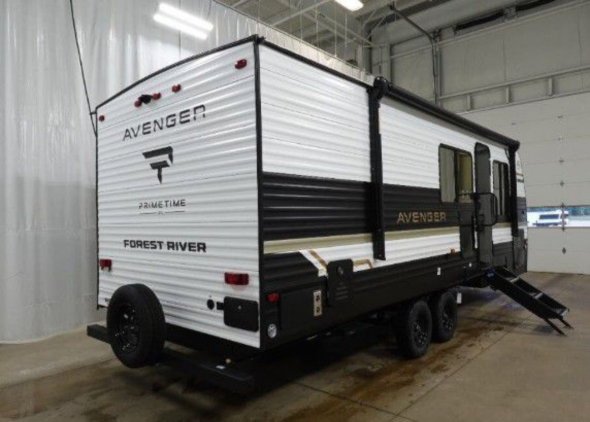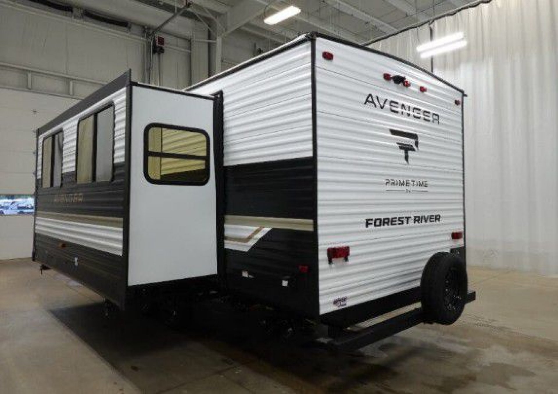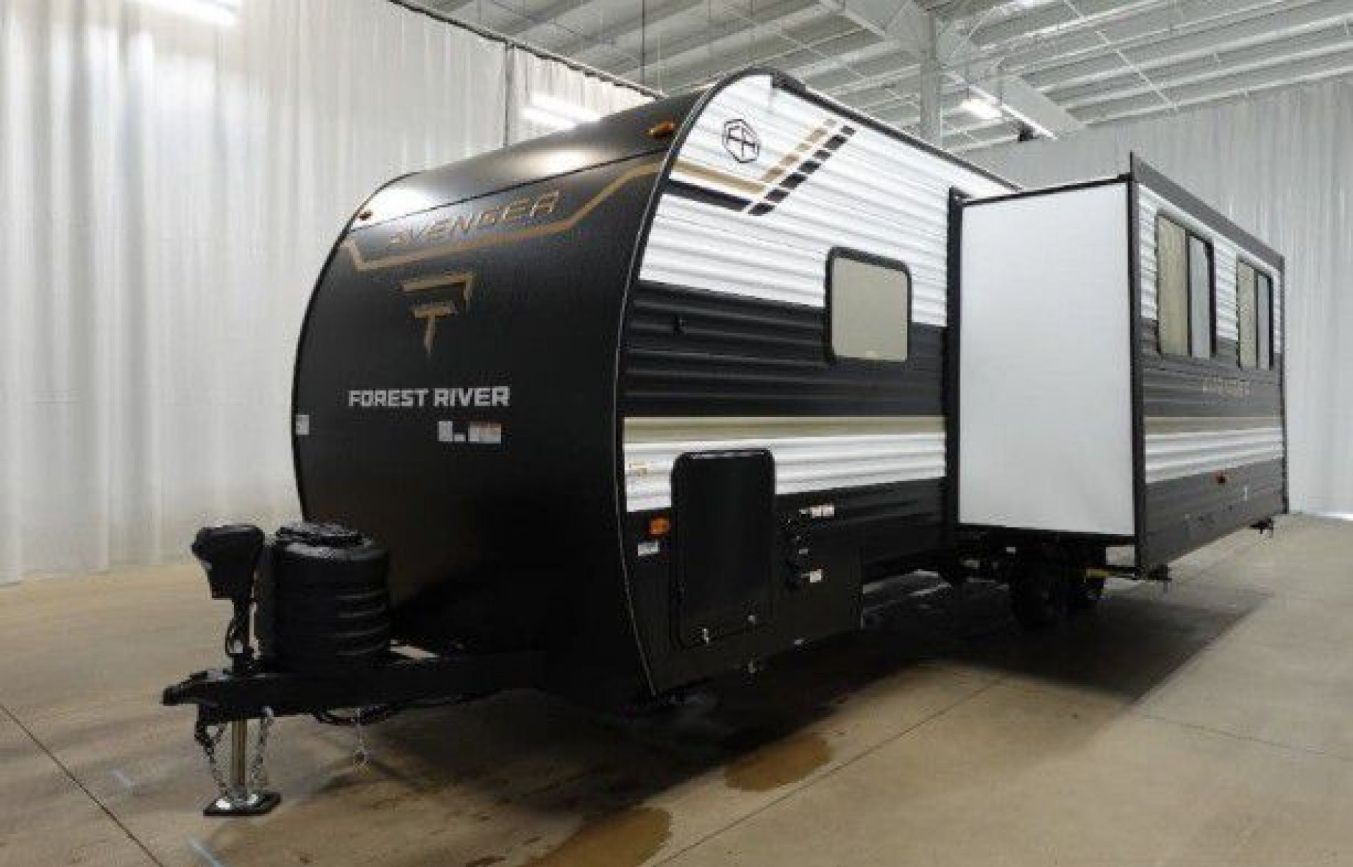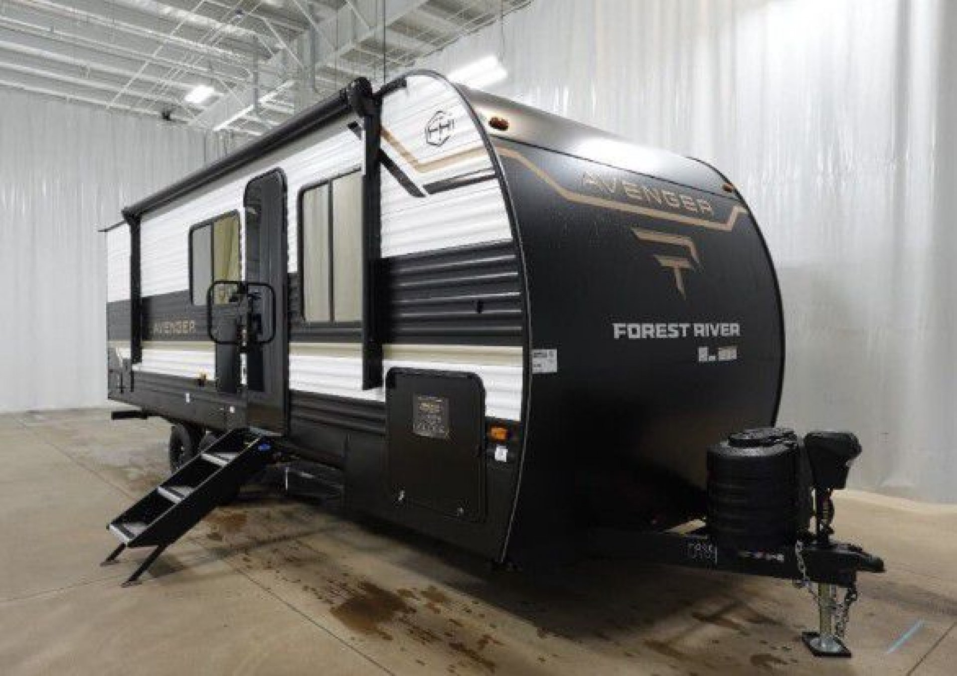 - Exterior Features: Power tongue jack, LP tank cover, safety chain & power cable mount, battery disconnect, solar prep, front rail LED light strips, fully enclosed underbelly, power stabilizer jacks, best-in-class drop frame pass-through storage, power awning with LED light strip, Tuff Coat on exterior metal, gold reflective exterior windows, black glass door with friction hinge, centrally located outdoor refrigerator, LP quick connect (most models), XL padded entry grab handle, bottle opener, Step Above sturdy step, exterior 110V outlets, bumper with spare tire, backup camera prep, exterior shower, triple seal slideout box, PVC roof membrane, 3/8” roof decking, 5/8” floor decking, silicone sealant, black tank flush, gutter rails, automotive name badging on exterior.