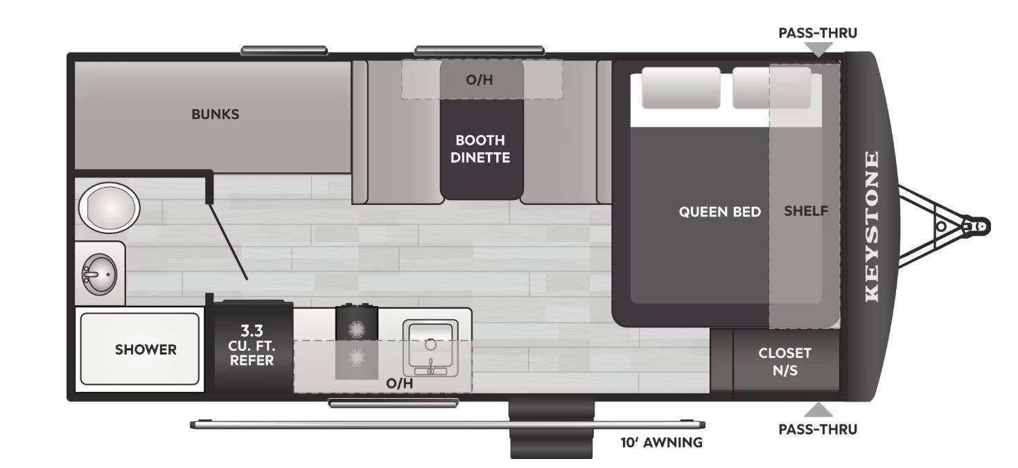 Specifications Specification Name Specification Value RV Type Travel Trailer Shipping Weight 3,036 lb. Carrying Capacity 1,314 lb. Hitch 355 lb. Length 20 ft 6 in Height 10 ft 2 in Tire-Size ST205/75R14D Fresh Water 21 gal Gray Water 30 gal Waste Water 30 gal Sleeping Capacity 6 Number of Propane Tanks 1 LPG 20 lb. Refrigerator Size 3.30 cu ft