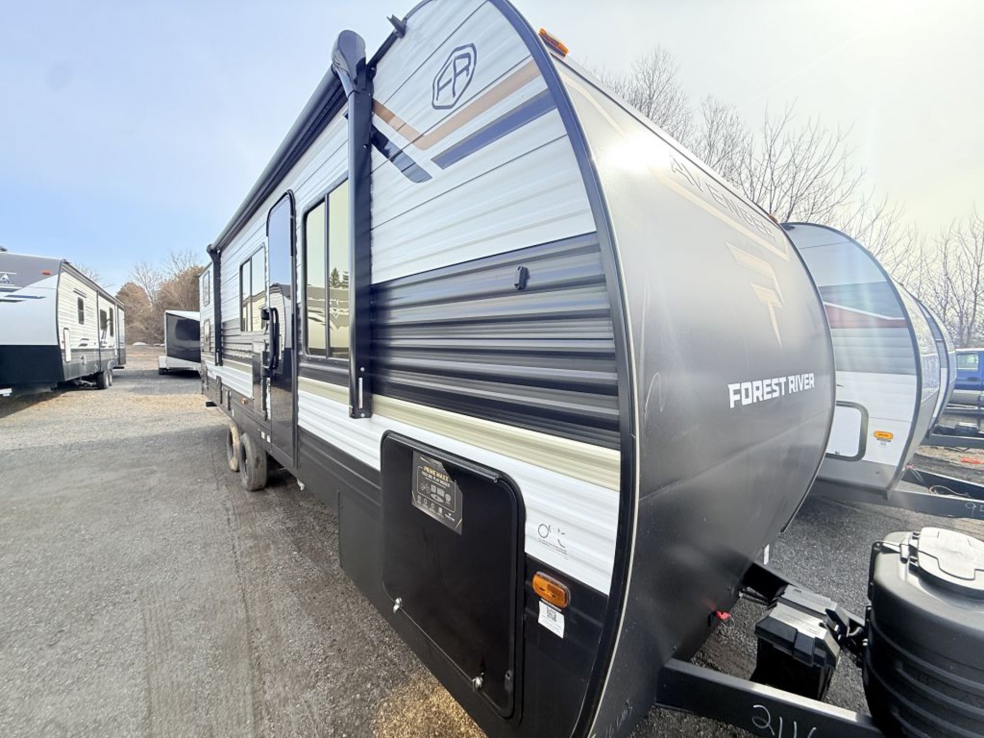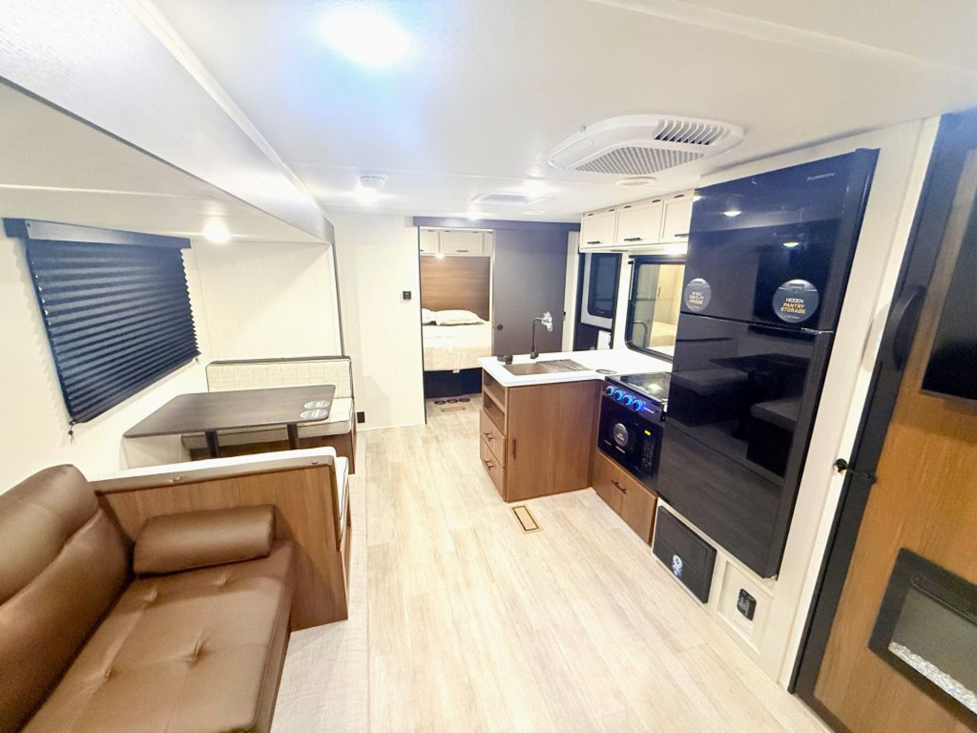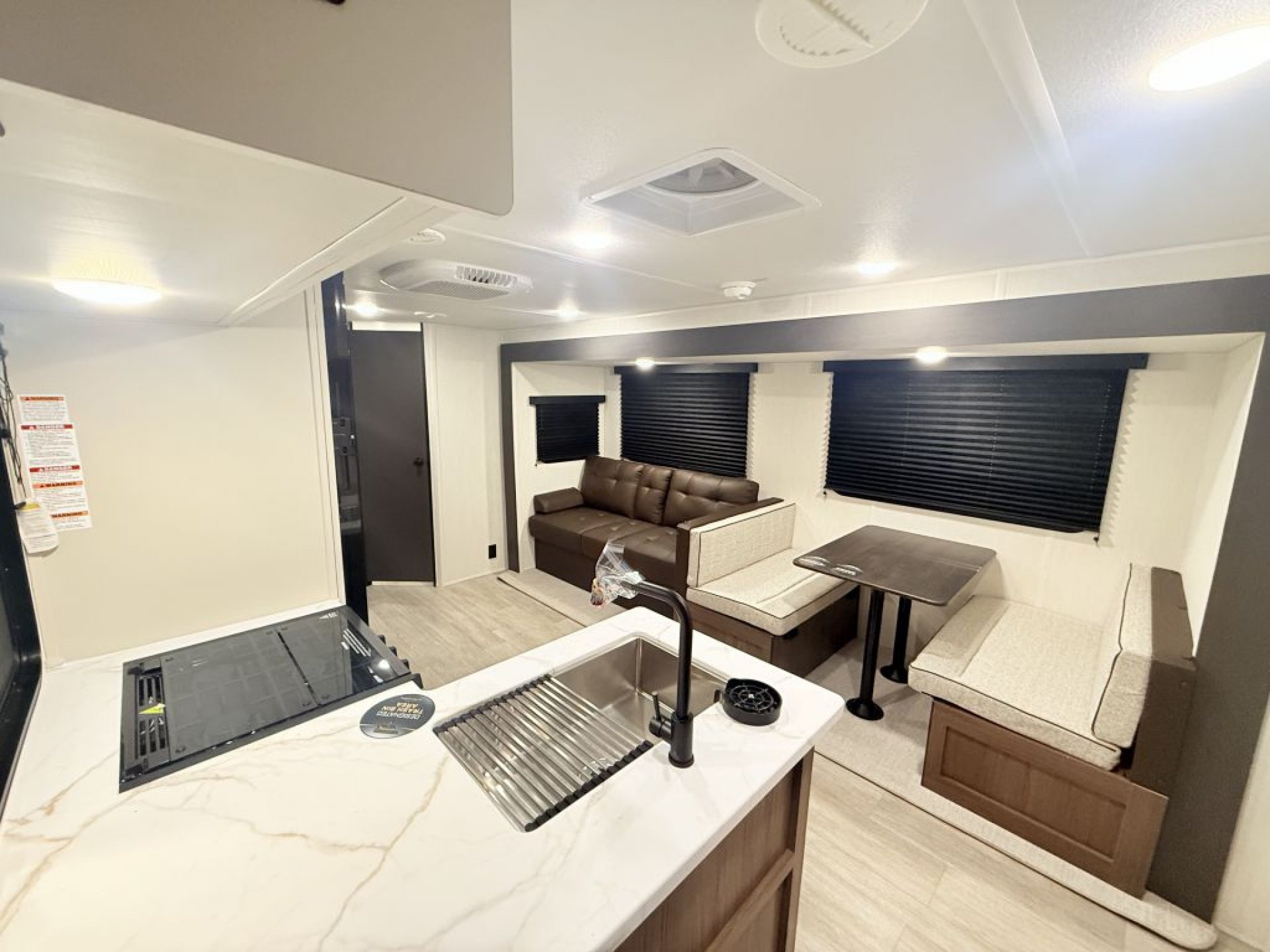 - Interior Features: Enclosed overhead storage in bedroom, dual shirt closets, bedside shelving with 110V outlets & USB ports, designer bedding package, massive bedroom window, Camp King bed, underbed storage with storage totes, TV prep in bedroom, designated shoe & pet bowl storage, stainless steel farmhouse sink, rolling sink cover/drying rack, two spice racks, two standard kitchen drawers, dedicated trash can storage, built-in convection microwave with air fryer, three-burner cooktop with glass cover, seamless pressed countertops, cup washer, onboard water filtration system, high-rise kitchen faucet, massive kitchen window, enclosed overhead storage in kitchen, 12V refrigerator 10.6 cu. ft., 12V kitchen fan, hidden pantry (most models), LED TV, electric fireplace (most models), jackknife sofa with cupholders, collapsible ottoman with storage, enhanced height bunks, USB ports in bunks, windows in both bunks, privacy curtain for bunks, teddy bear bunk mattresses, storage space below bunks, woven PVC marine grade slideout flooring, Congoleum flooring, designer shower surround with integrated shelving, foot flush toilet, medicine cabinet, tank monitor, 30K BTU furnace, tankless on-demand water heater, 15K ducted A/C