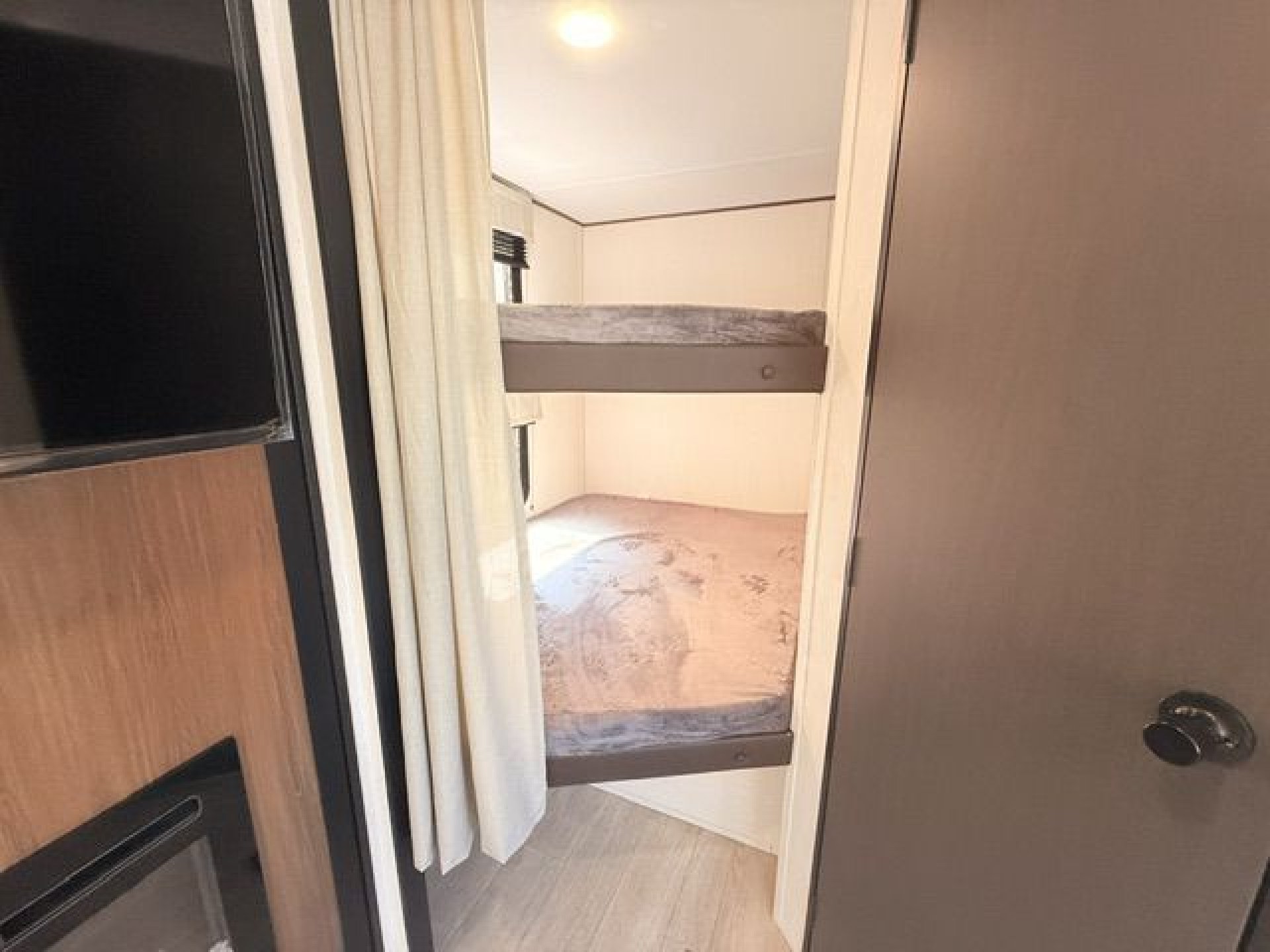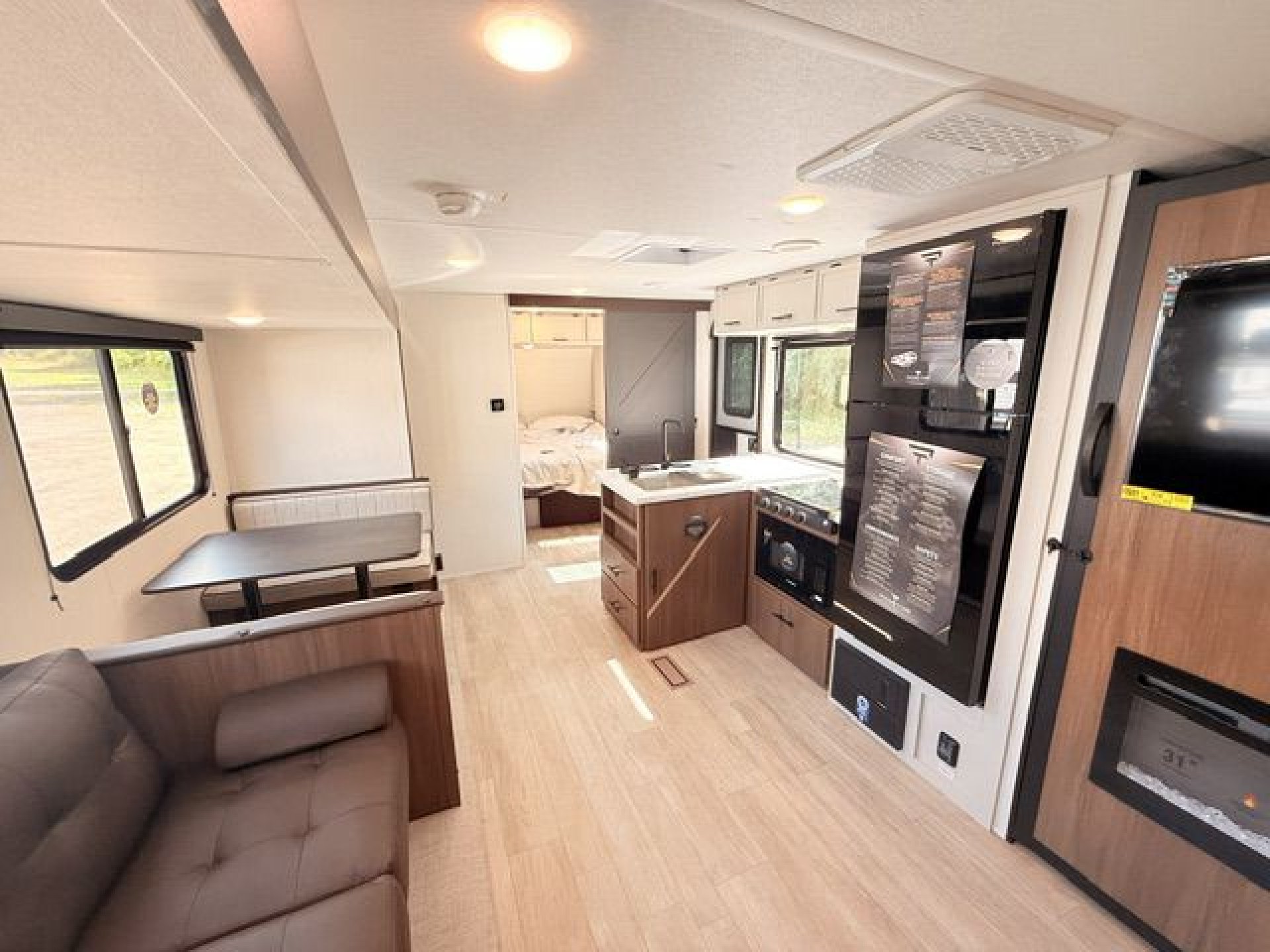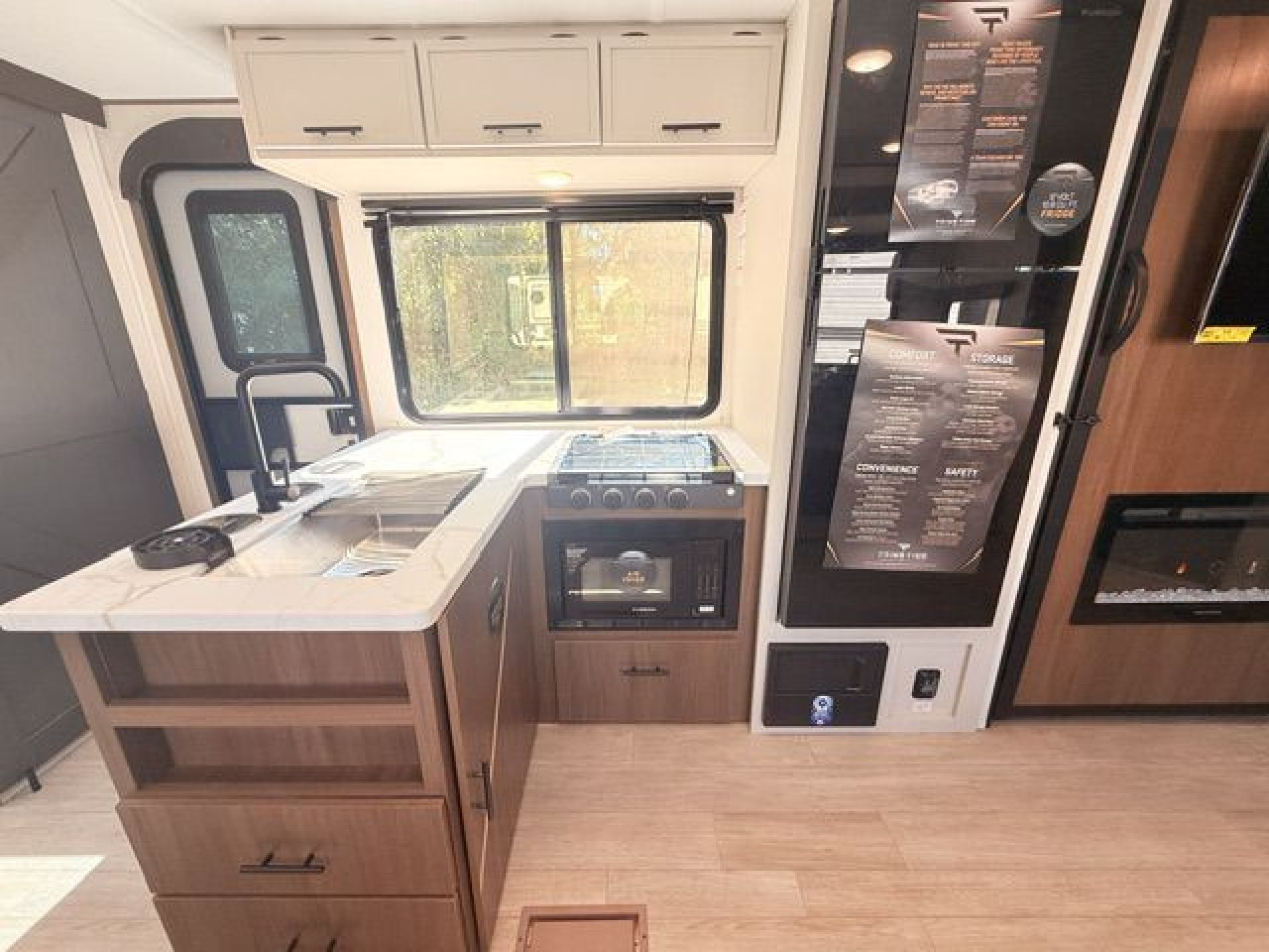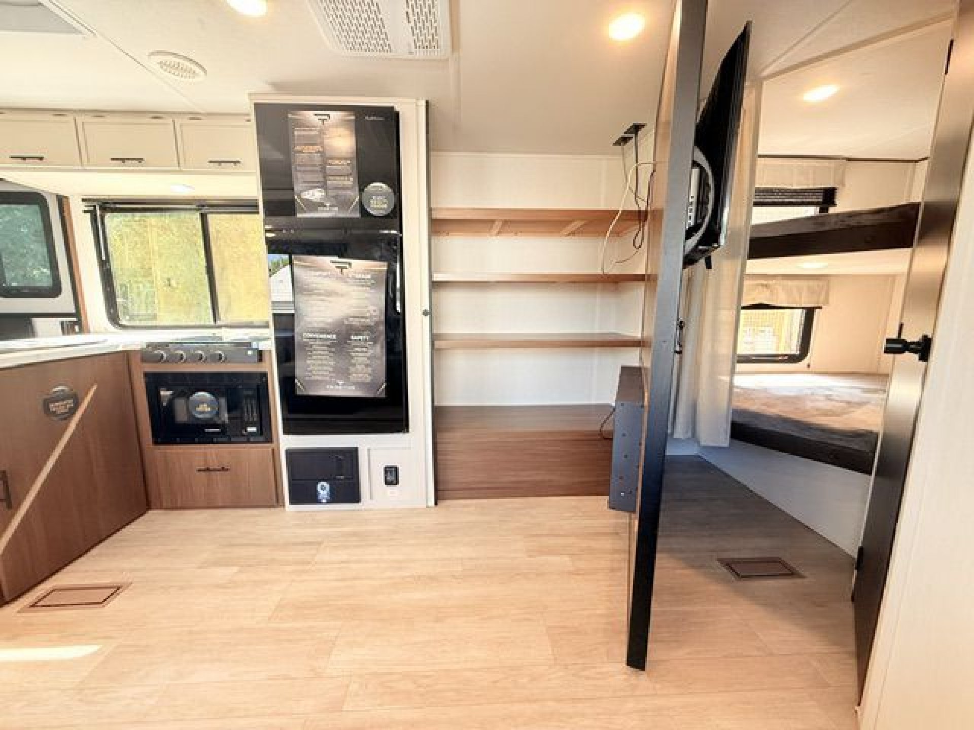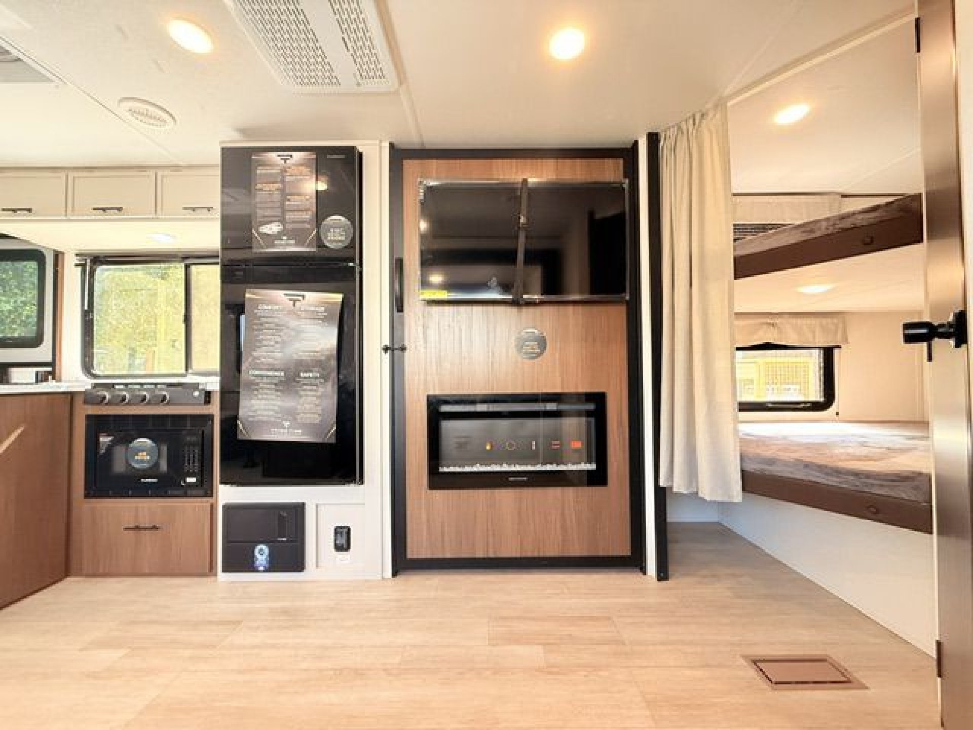 - Interior Features: Enclosed overhead storage in bedroom, dual shirt closets, bedside shelving with 110V outlets & USB ports, designer bedding package, massive bedroom window, Camp King bed, underbed storage with storage totes, TV prep in bedroom, designated shoe & pet bowl storage, stainless steel farmhouse sink, rolling sink cover/drying rack, two spice racks, two standard kitchen drawers, dedicated trash can storage, built-in convection microwave with air fryer, three-burner cooktop with glass cover, seamless pressed countertops, cup washer, onboard water filtration system, high-rise kitchen faucet, massive kitchen window, enclosed overhead storage in kitchen, 12V refrigerator 10.6 cu. ft., 12V kitchen fan, hidden pantry (most models), LED TV, electric fireplace (most models), jackknife sofa with cupholders, collapsible ottoman with storage, enhanced height bunks, USB ports in bunks, windows in both bunks, privacy curtain for bunks, teddy bear bunk mattresses, storage space below bunks, woven PVC marine grade slideout flooring, Congoleum flooring, designer shower surround with integrated shelving, foot flush toilet, medicine cabinet, tank monitor, 30K BTU furnace, tankless on-demand water heater, 15K ducted A/C