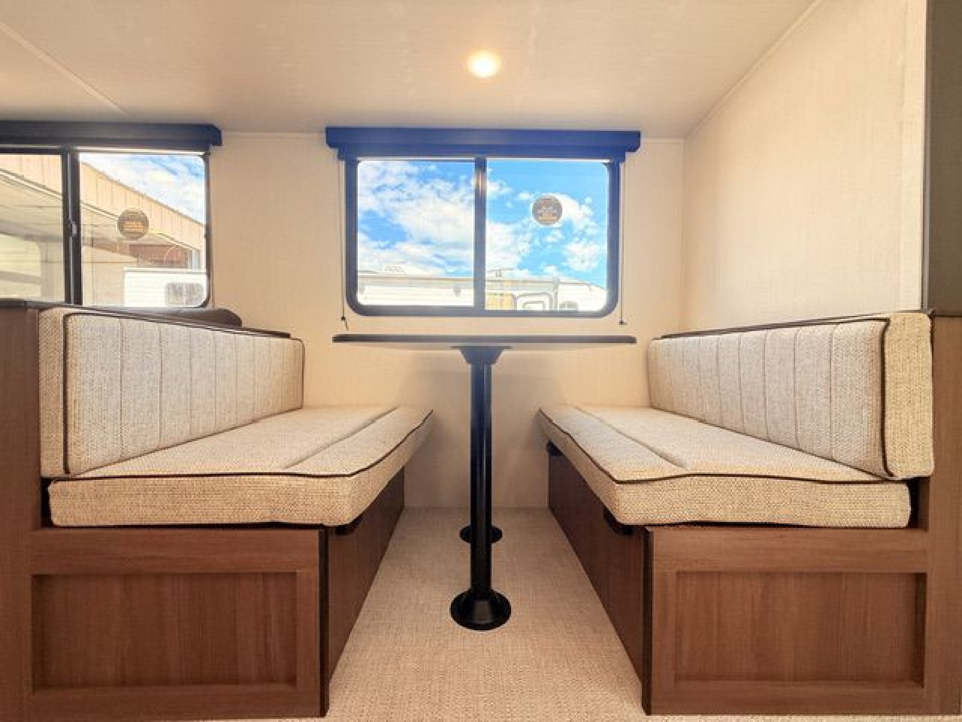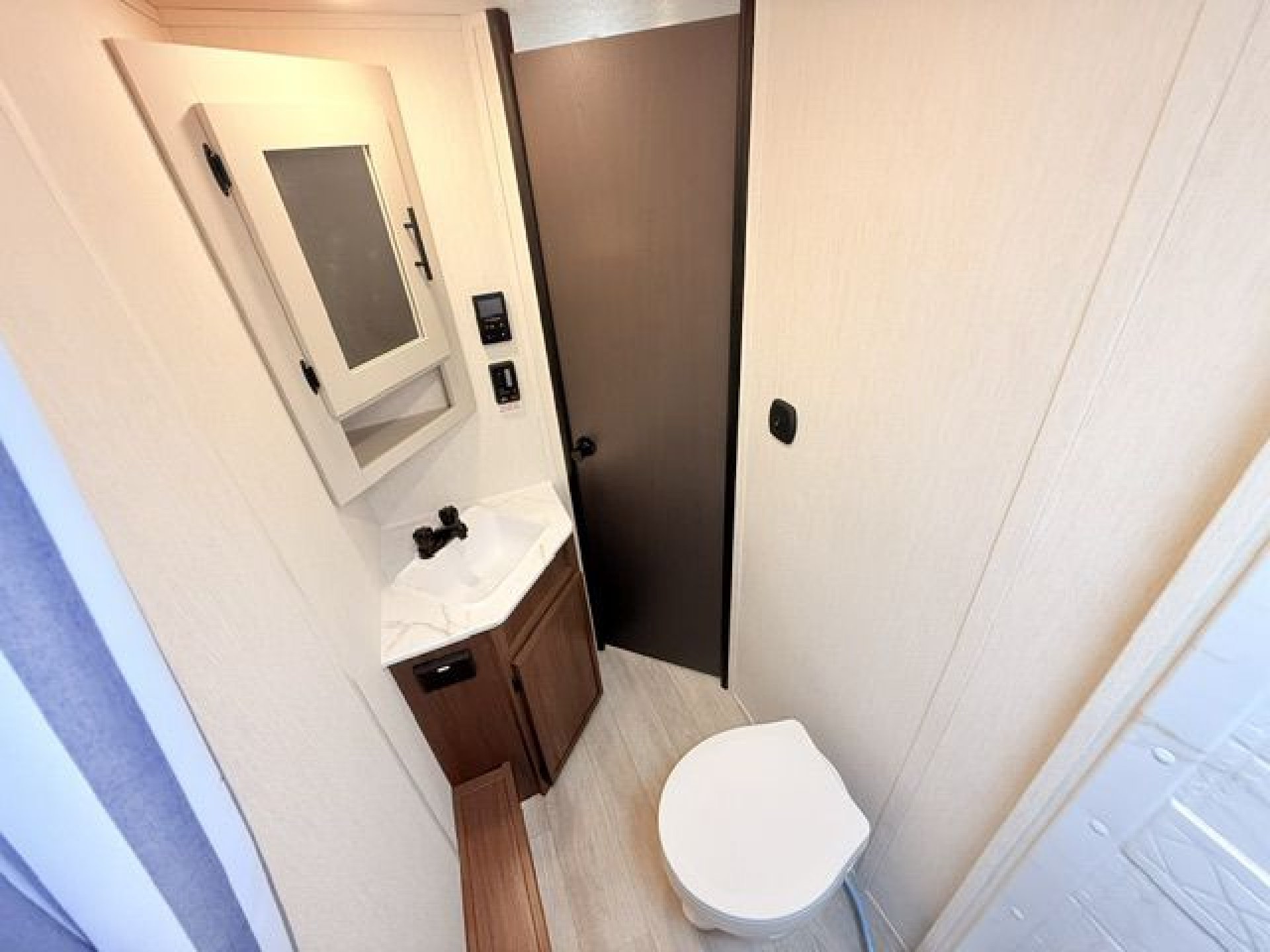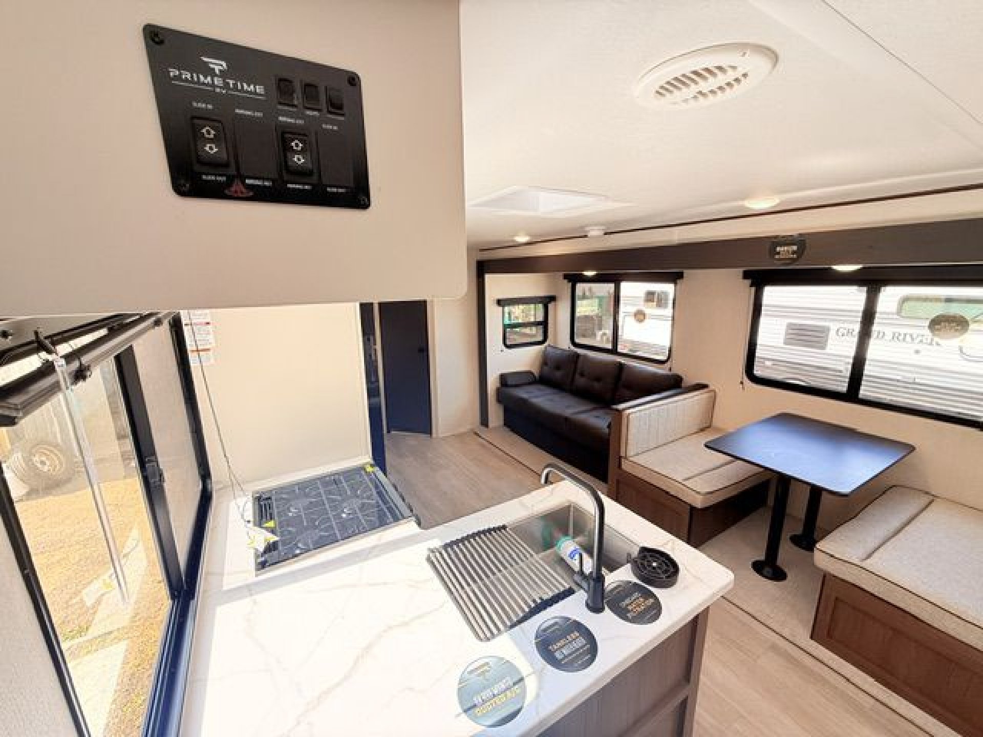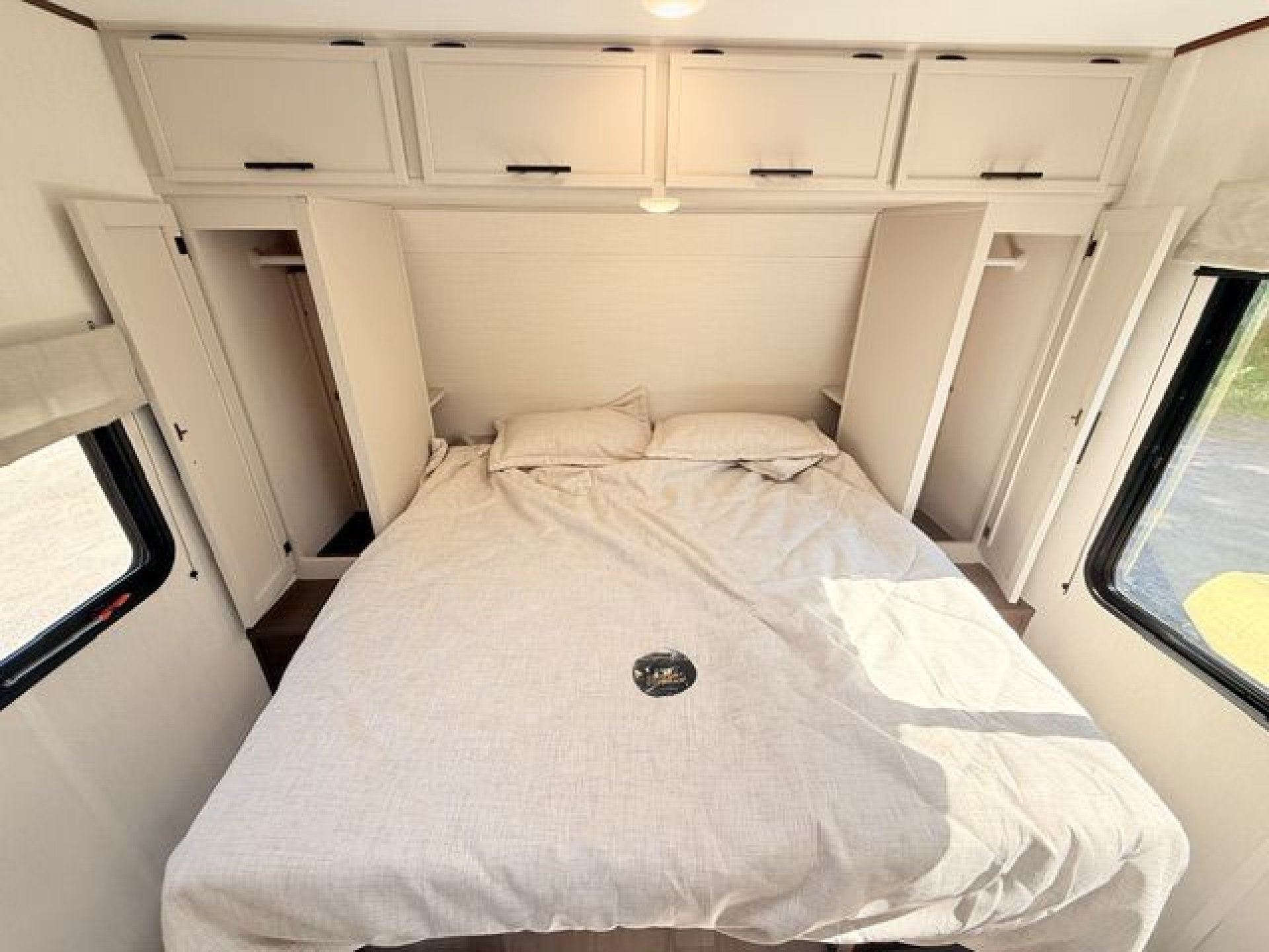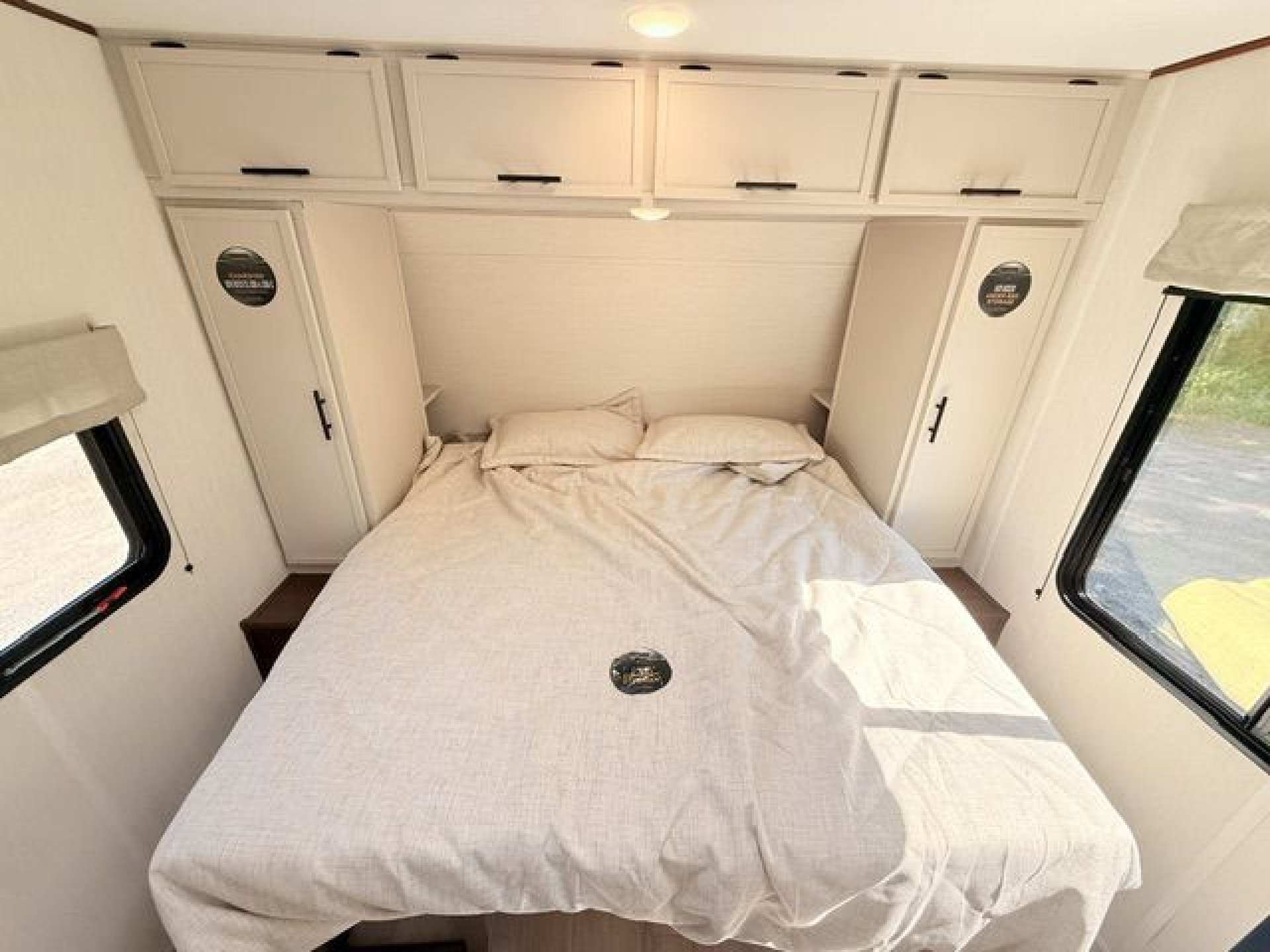 - Interior Features: Enclosed overhead storage in bedroom, dual shirt closets, bedside shelving with 110V outlets & USB ports, designer bedding package, massive bedroom window, Camp King bed, underbed storage with storage totes, TV prep in bedroom, designated shoe & pet bowl storage, stainless steel farmhouse sink, rolling sink cover/drying rack, two spice racks, two standard kitchen drawers, dedicated trash can storage, built-in convection microwave with air fryer, three-burner cooktop with glass cover, seamless pressed countertops, cup washer, onboard water filtration system, high-rise kitchen faucet, massive kitchen window, enclosed overhead storage in kitchen, 12V refrigerator 10.6 cu. ft., 12V kitchen fan, hidden pantry (most models), LED TV, electric fireplace (most models), jackknife sofa with cupholders, collapsible ottoman with storage, enhanced height bunks, USB ports in bunks, windows in both bunks, privacy curtain for bunks, teddy bear bunk mattresses, storage space below bunks, woven PVC marine grade slideout flooring, Congoleum flooring, designer shower surround with integrated shelving, foot flush toilet, medicine cabinet, tank monitor, 30K BTU furnace, tankless on-demand water heater, 15K ducted A/C
