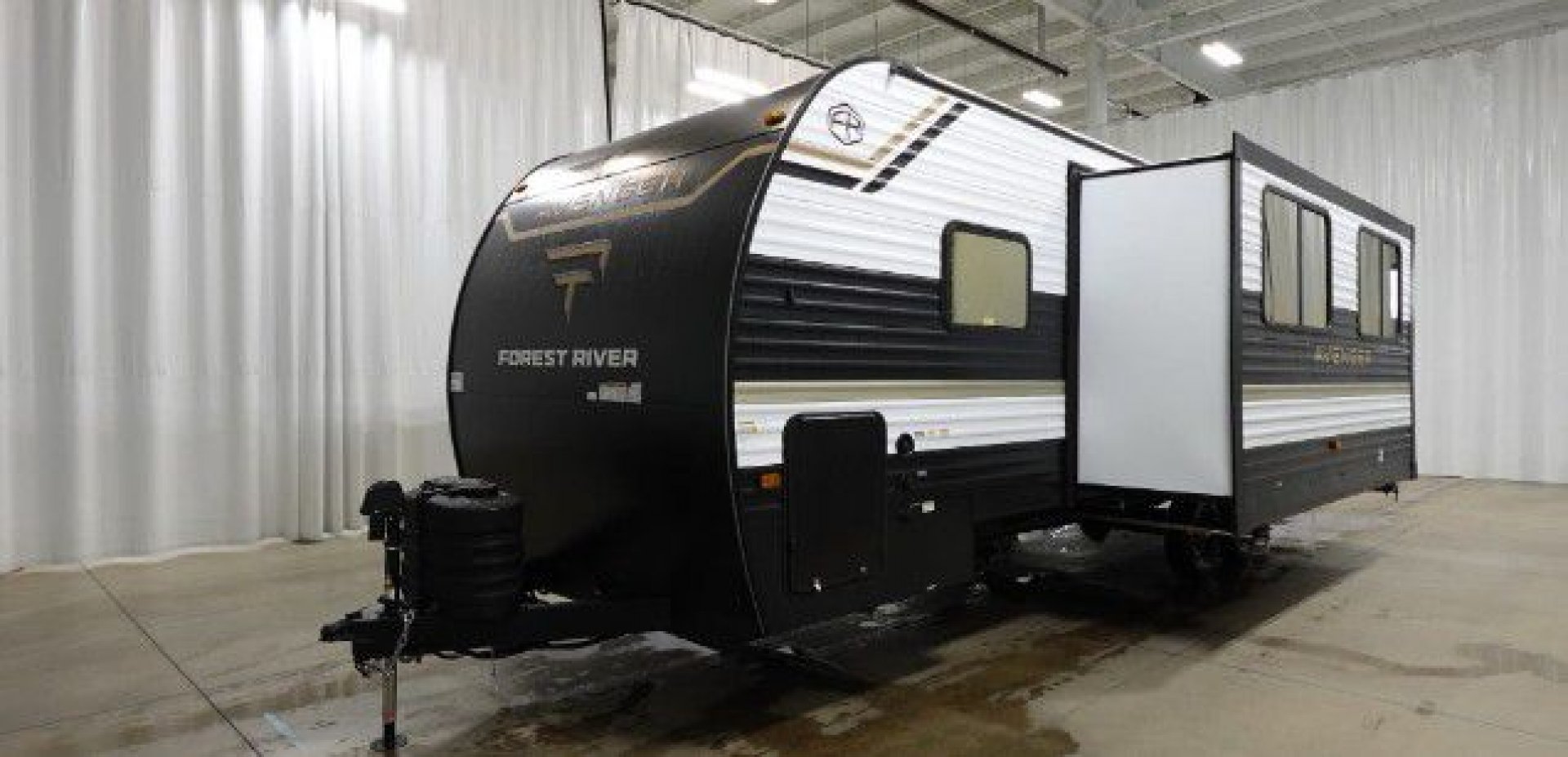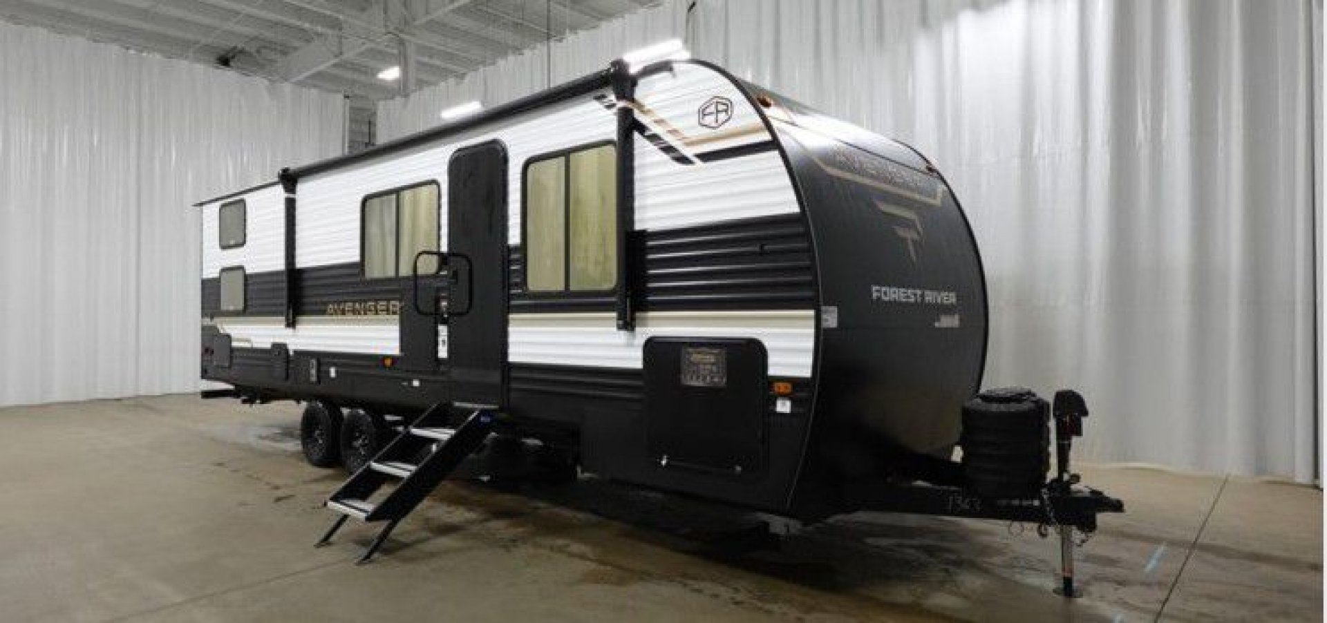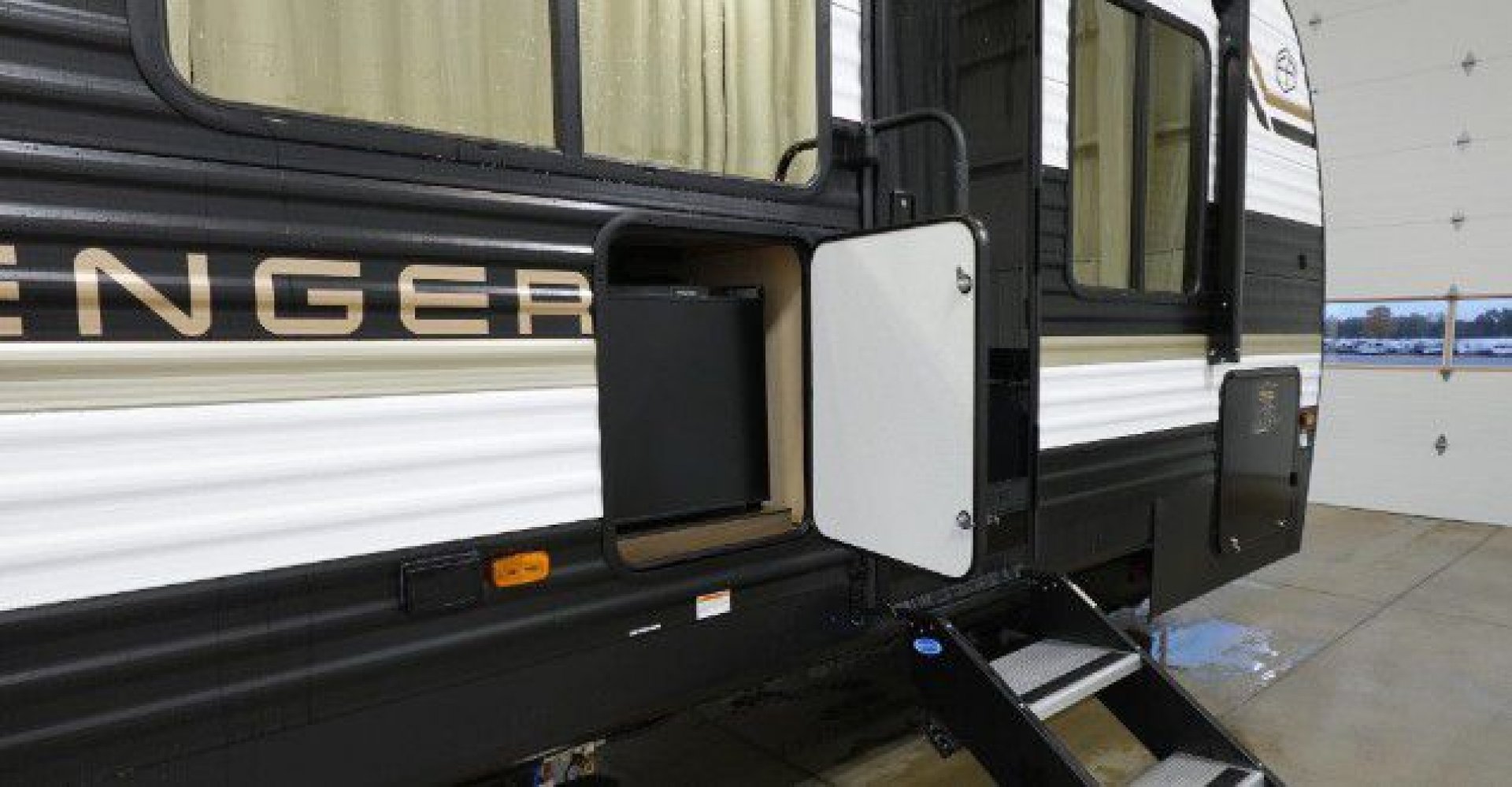 - Exterior Features: Power tongue jack, LP tank cover, safety chain & power cable mount, battery disconnect, solar prep, front rail LED light strips, fully enclosed underbelly, power stabilizer jacks, drop frame pass-through storage, Tuff-Coat exterior metal, gold reflective exterior windows, black glass door with friction hinge, centrally located outdoor refrigerator, LP quick connect (most models), XL padded entry grab handle, bottle opener, Step Above sturdy step, exterior 110V outlets, bumper with spare tire, backup camera prep, exterior shower, triple seal slideout box, PVC roof membrane, 3/8” roof decking, 5/8” floor decking, silicone sealant, black tank flush, gutter rails, automotive name badging on exterior