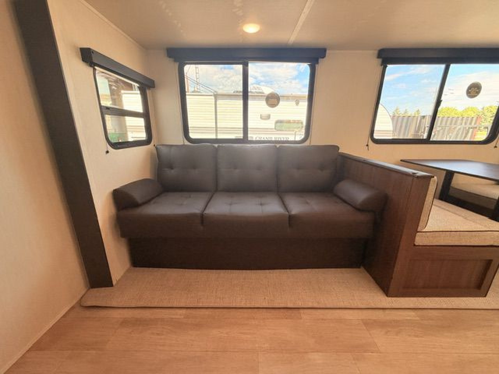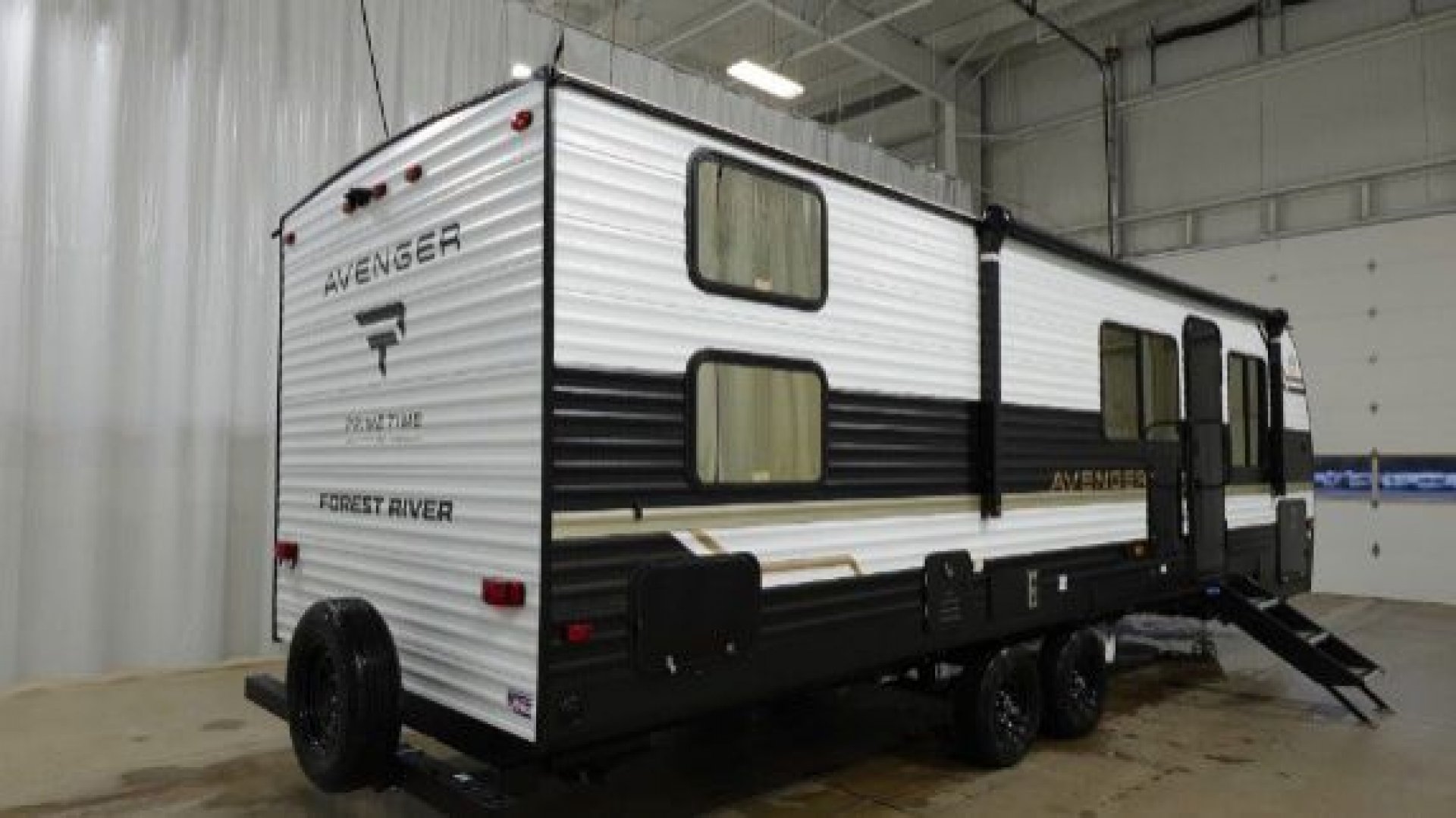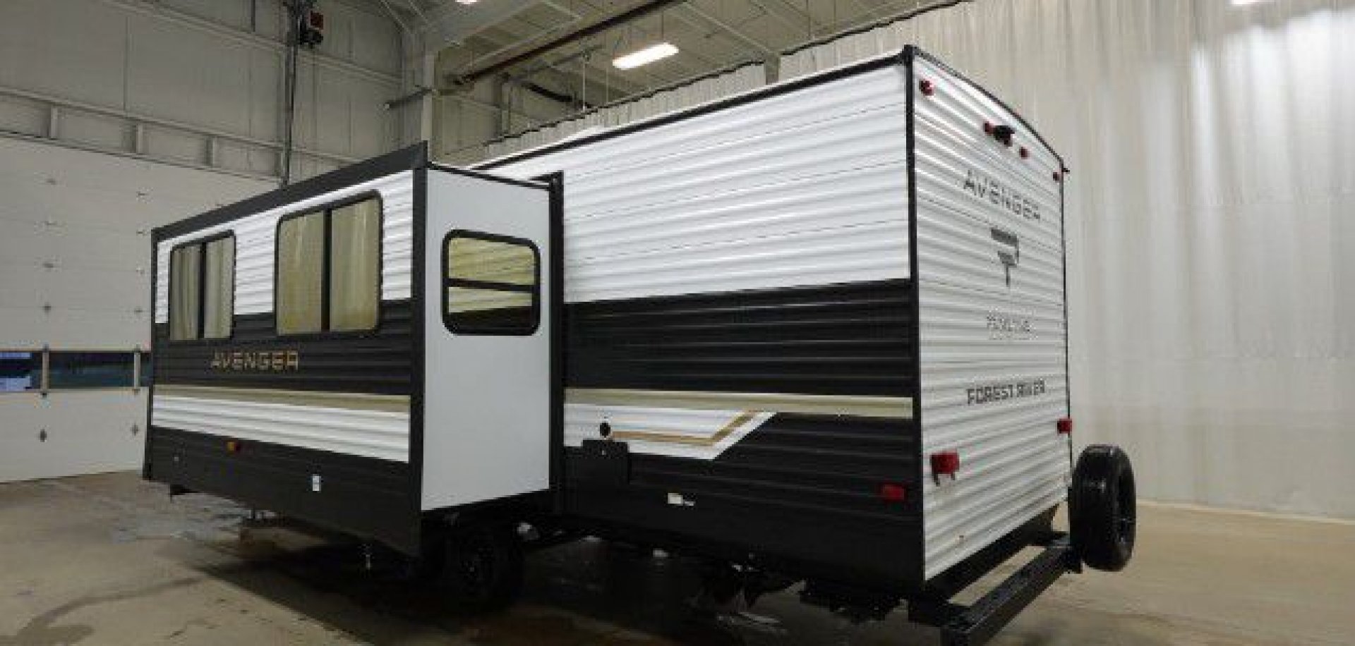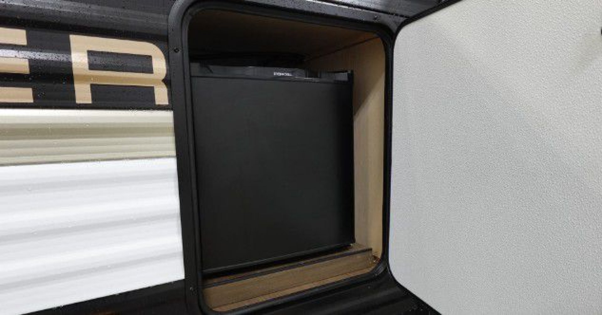 - Exterior Features: Power tongue jack, LP tank cover, safety chain & power cable mount, battery disconnect, solar prep, front rail LED light strips, fully enclosed underbelly, power stabilizer jacks, drop frame pass-through storage, Tuff-Coat exterior metal, gold reflective exterior windows, black glass door with friction hinge, centrally located outdoor refrigerator, LP quick connect (most models), XL padded entry grab handle, bottle opener, Step Above sturdy step, exterior 110V outlets, bumper with spare tire, backup camera prep, exterior shower, triple seal slideout box, PVC roof membrane, 3/8” roof decking, 5/8” floor decking, silicone sealant, black tank flush, gutter rails, automotive name badging on exterior